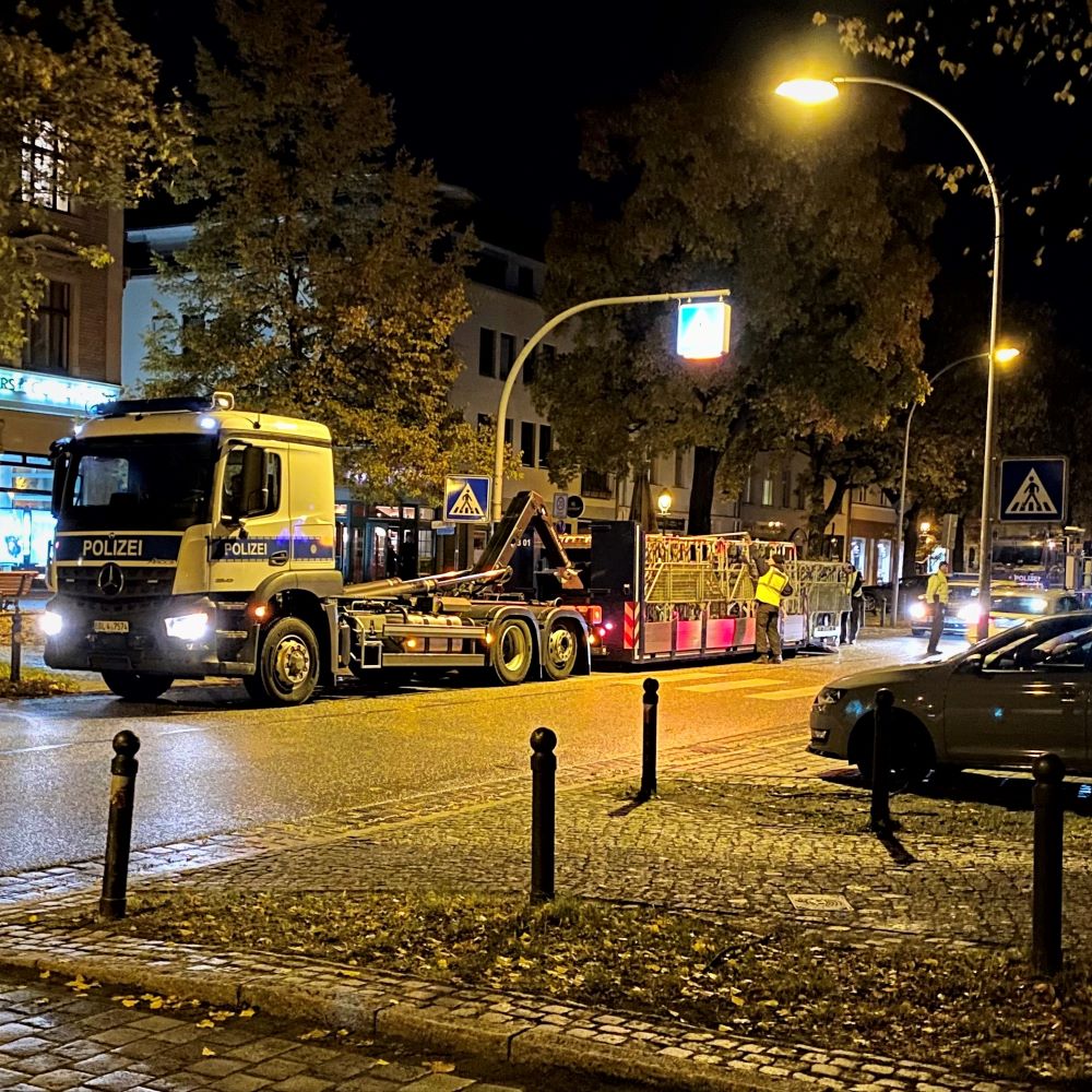 Nachdem dem Check-in ging es gleich weiter nach Potsdam-Babelsberg. Denn der erste Leckerbissen meines fußballerischen Fünf-Gänge-Menüs an diesem Wochenende hieß SV Babelsberg 03 vs. 1.FC Lokomotive Leipzig. Dieses Hors-d’œuvre hatte durch divergierende Weltanschauungen in den Fanlagern – ohne jetzt beiden Szenen jegliche Heterogenität absprechen zu wollen – eine gewisse politische Würze. Also wurde sich im Vorfeld um ein Ticket bemüht (12 € für’n Sitzplatz auf der Haupttribüne) und um 18:20 Uhr erreichte ich den Potsdamer Stadtteil Babelsberg. Es ging nun im strömenden Regen zu Fuß die 900 Meter zum Karl-Liebknecht-Stadion. Dabei waren alle Querstraßen, die Richtung Gästebereich von der Karl-Liebknecht-Straße abzweigten, hermetisch von der Polizei abgeriegelt.