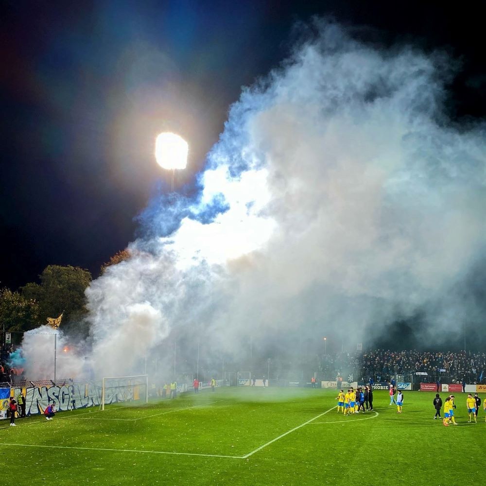 Dann rollte der Ball und das Spiel war keine fünf Minuten alt, als die Gästefans eine kleine Blockfahne mit ihrem Vereinslogo über den Köpfen entrollten. Darunter wurden ein paar Jäckchen getauscht (oder gesinnungsuntypisch auf „links“ gedreht) und Sturmhauben aufgesetzt. Als die Fahne wieder eingerollt war, dürfte jedem klar gewesen sein, was der nächste Akt werden sollte. Die Fanszene von Lok fackelte nun ordentlich rum und der Stadionsprecher schimpfte pflichtschuldig im brandenburgischen Idiom. Aufgrund der Rauchentwicklung war das Spiel kurzzeitig unterbrochen, aber anschließend bekam der Ballsport tatsächlich etwas Raum zum Entfalten.
