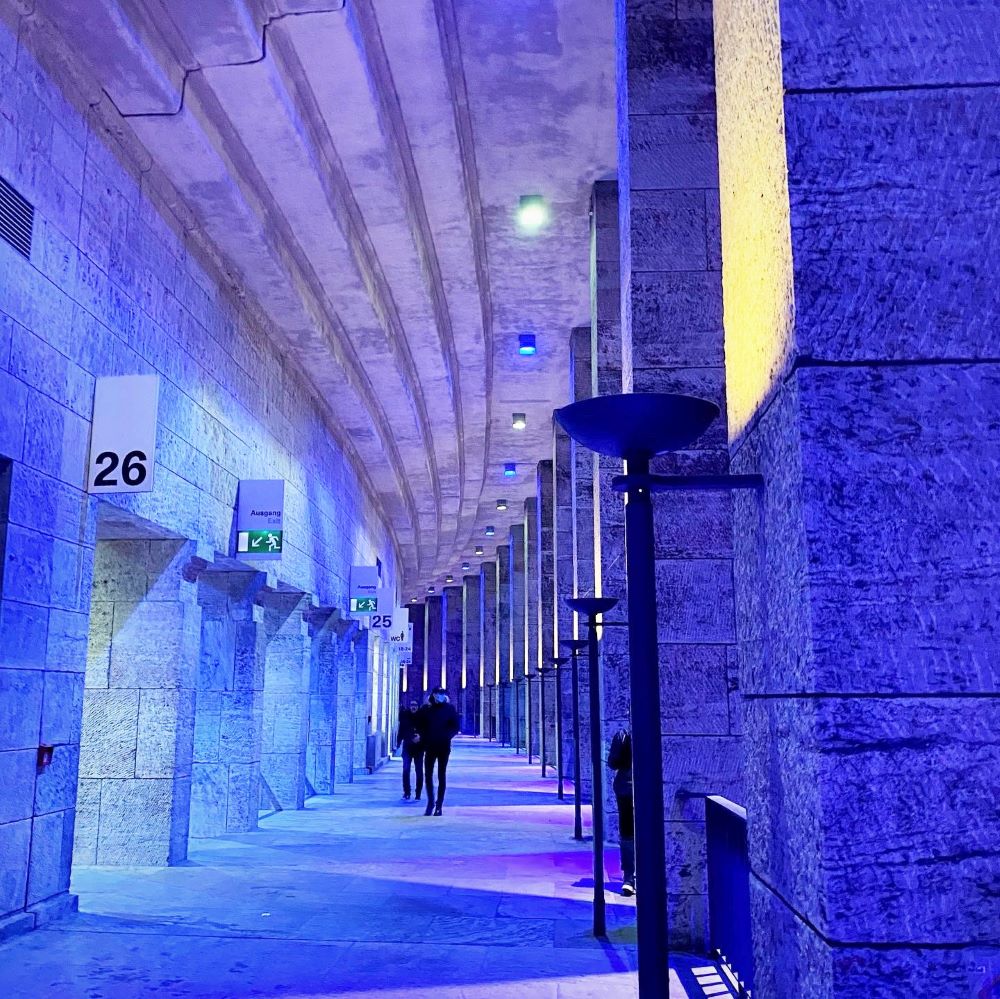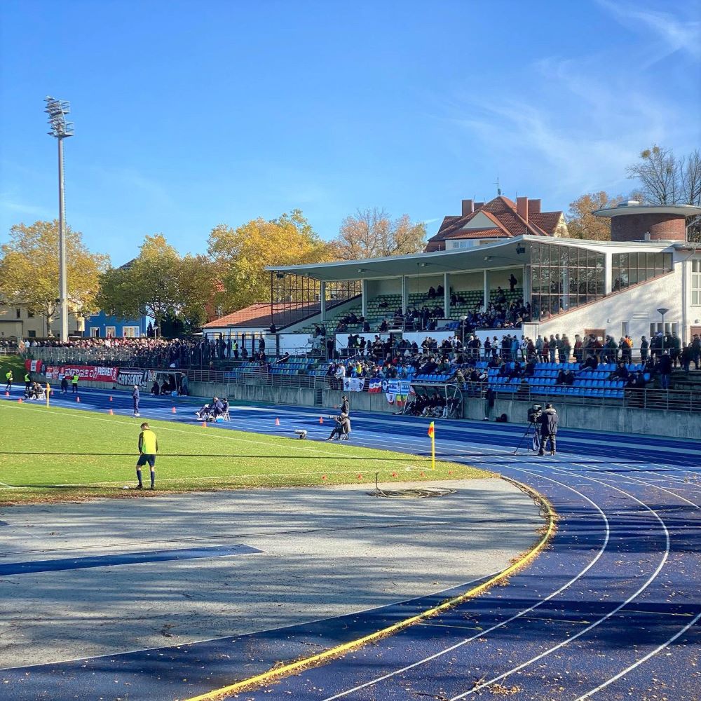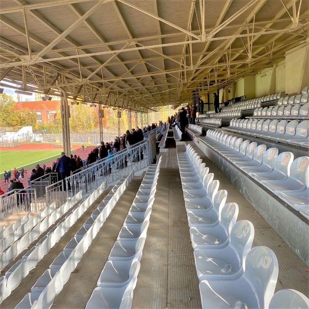 Vom Sowjetischen Ehrenmal ging es nun weiter zum ca. 1.896 Meter entfernten Poststadion, dessen Eingangstor ich 12:48 Uhr passierte. 10 € Eintritt und ein 3G-Nachweis wurden verlangt und zugänglich war lediglich die Haupttribüne der 1929 eröffneten Sportstätte. Hier fanden 1934 und 1936 übrigens die Endspiele um die Deutsche Fußballmeisterschaft statt (jeweils vor 45.000 Zuschauern). Außerdem war das Poststadion 1936 Spielstätte des Olympischen Fußballturniers. Vor den Augen Adolf Hitlers (und ungefähr 55.000 weiteren Augenpaaren) schied die deutsche Auswahlmannschaft im Viertelfinale gegen die Fußballmacht Norwegen aus (0:2).