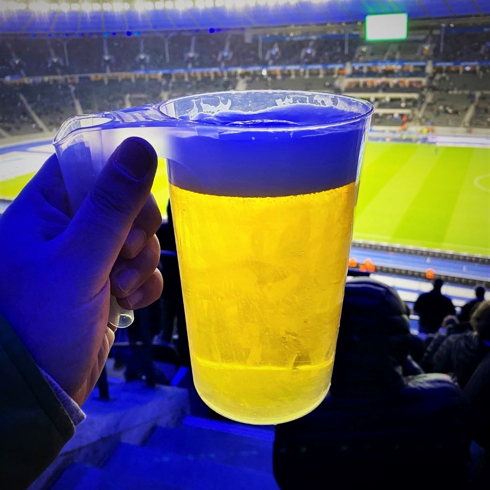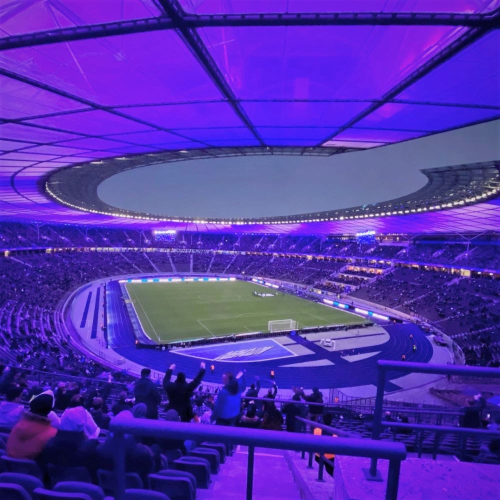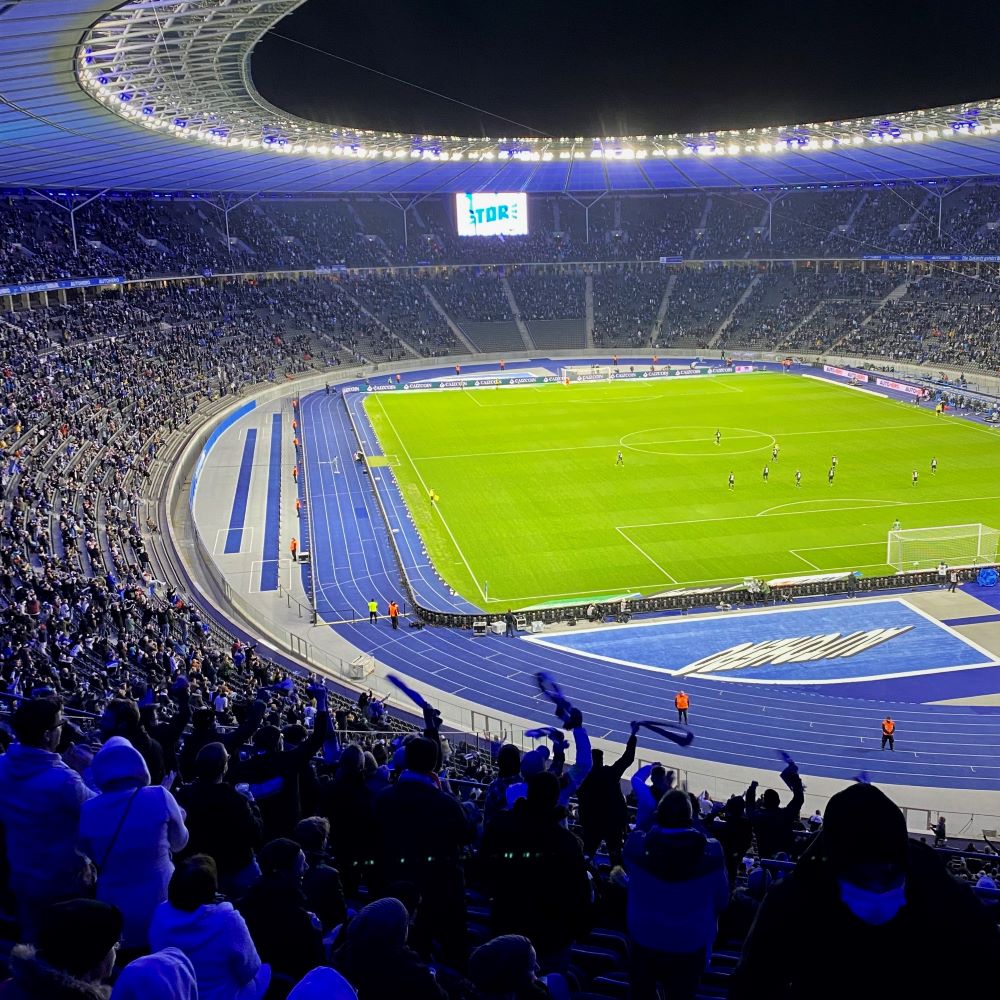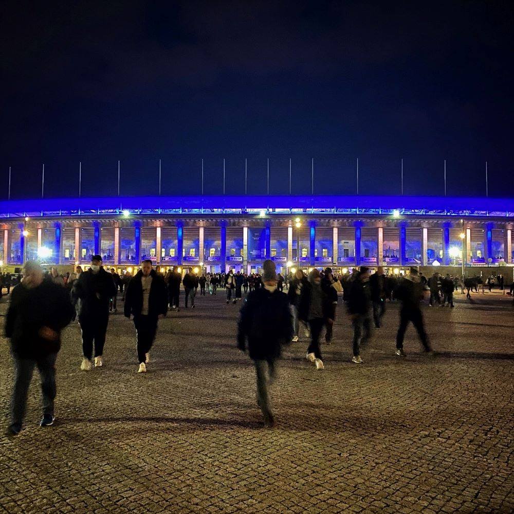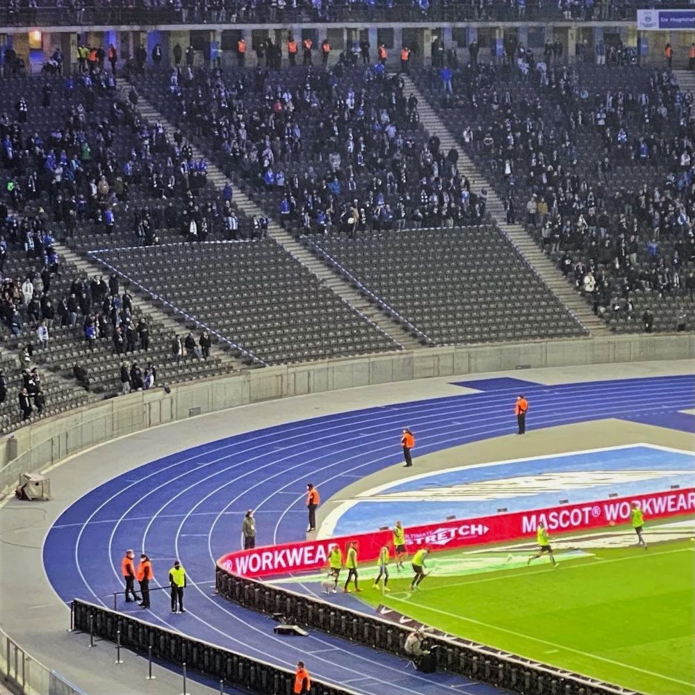Vom Hotel nahm ich eine U-Bahn um 17:33 Uhr und war nach einem Umstieg in Spandau um kurz vor 18 Uhr am S-Bahnhof Olympiastadion. Der Einlass am Südtor ging trotz erhöhtem Kontrollaufwand (bedingt durch 3G) relativ flott, so dass ich 13 Minuten (und 12 Sekunden) vor Anpfiff auf meinem bzw. einem Platz im Oberrang der Marathonkurve saß. Aufgrund der niedrigen Auslastung heute, herrschte mehr oder weniger freie Platzwahl. Da lief so’n fauler Hund wie ich natürlich nicht die Treppe bis Reihe 30 hoch, sondern platzierte sich gleich über’m Mundloch.