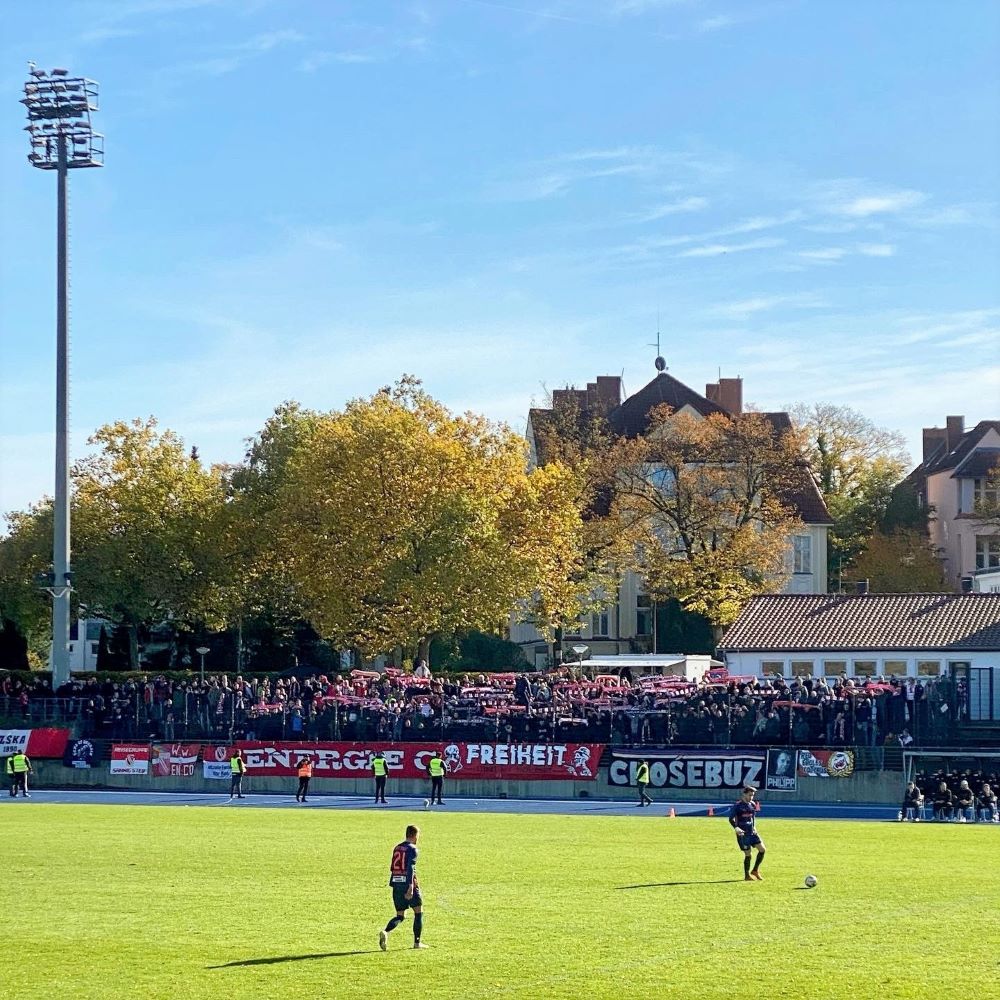 Zum heutigen Kick hatten sich ca. 250 Tasmanen und rund 400 Cottbuser im Stadion Lichterfelde eingefunden. Der Gästeauftritt war dabei stimmungsmäßig solide und sorgte durchaus für annehmbare Fußballatmosphäre an diesem Sonntagmittag. Neben diversen Fangesängen über die Spieldauer verteilt, gab es zu Beginn eine schöne Schalparade und den mehrstrophigen Klassiker „Märkische Heide, märkischer Sand“. Bei den Tasmanen war leider nur eine kleine Schar von ca. 20 Leuten wirklich sangesfreudig und schmetterte zumindest hin und wieder ihre Schlachtrufe “Ra-Ra-Ra! Tasmania!” und “Heja, Heja, Neuköllner”, um die Mannschaft zu unterstützen.