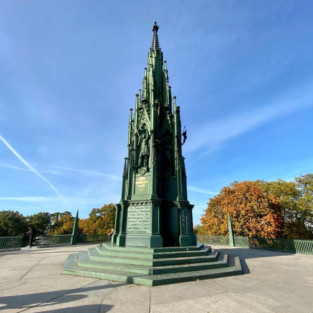 Weil ich am Samstagabend doch schon gegen 23 Uhr im Bett lag, war ich Sonntagmorgen bereits gegen 8 Uhr regelrecht ausgeschlafen. Nach der Körperpflege sah ich keinen Sinn mehr darin weiter im Hotel zu verweilen. Ich checkte aus und nahm die nächstbeste U-Bahn nach Kreuzberg. Denn mein Entremet de fromage sollte um 10:30 Uhr Hilalspor vs. Reinickendorfer Füchse werden. Der Gastgeber empfing seinen Pflichtspielgegner im Kreuzberger Willy-Kressmann-Stadion. Diese Sportanlanlage liegt am Fuße der für den Stadtteil namensgebenden Erhebung. Auf jenem 66 Meter hohen Hügel wurde zwischen 1818 und 1821 das deutsche Nationaldenkmal für die Befreiungskriege errichtet. Natürlich erklomm ich den Kreuzberg vor meinem Spielbesuch und wurde dort an diverse Schlachten vor über 200 Jahren erinnert.