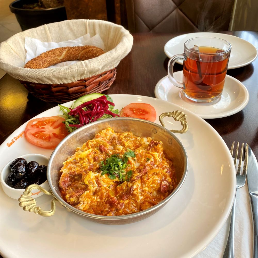 Da Frühstück in meinem Hotelsondertarif nicht inkludiert war, schaute ich mich mal in der Nachbarschaft des Mercure Berlin City West (****) um. Am Siemensstädter Siemensdamm gab es nicht nur diverse Liegenschaften des Konzerns Siemens, sondern durchaus auch einiges an Gastronomie. Beispielsweise ein türkisches Frühstückslokal namens Simit Dünyasi. Die hatten Menemen mit Sucuk auf der Karte und ich hatte richtig Bock auf diese würzige Eierspeise. Ein bisschen Salat, ein paar eingelegte Oliven, sowie ein Simit (Sesamring) wurden ebenfalls gereicht (alles zusammen 7 €). Dazu noch türkischer Tee für 1,50 € und ich war sehr zufrieden mit meinem kulinarischen Start in den Tag.