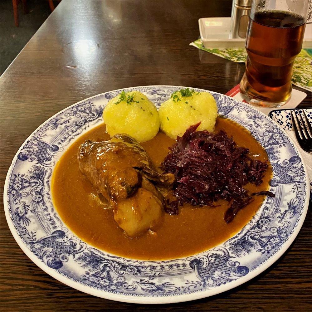 War alles sehr urig dort. Westberliner Eckkneipen-Chick mit klassischer Hausmannskost auf der Speisekarte. Ich konnte bei meinem Erstbesuch dem Signature Dish Rouladen natürlich nicht widerstehen. Gab sogar mehrere Variationen. Aber ich wollte es ganz klassisch. Eine schöne Rinderroulade mit Zwiebeln, Speck und Gürkchen gefüllt (Bernd Stromberg würde sich hier also nicht mit dem Koch anlegen müssen). Dazu Sauce, Rotkohl und Kartoffelklöße. Ei, war das gut! Konnte sich sogar mit den Rouladen von Muttern messen, wenn auch der Berliner Vertreter knapp zweiter Sieger wird.