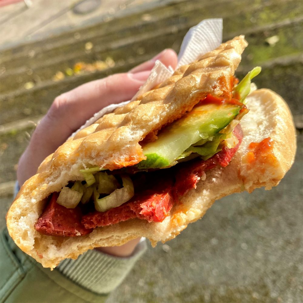 Doch zurück in die Gegenwart… Da mein Magen wie Sau knurrte, gönnte ich mir noch vor Anpfiff als Frühstück eine Pita mit Sucuk und Salat. Ich zog nun einmal durch das Stadionrevier und markierte hier und da mal (in der Hopper-App), dass ich da war. Das anschließende Fußballspiel war zwar keine sportliche Exzellenz, aber für 6.Liga schon okay. Hilalspor hatte die favorisierten Gäste zunächst gut im Griff. Doch in der 43.Minute dachte sich Samir Werbelow „Ein Fuchs muss tun, was ein Fuchs tun muss“ und startete ein Solo über das halbe Spielfeld, welches er mit dem Tor des Tages abschloss.
