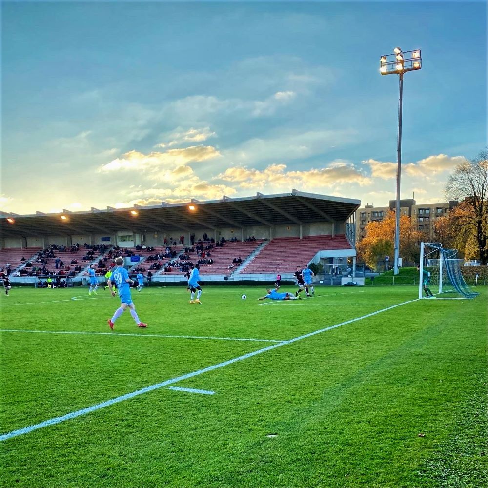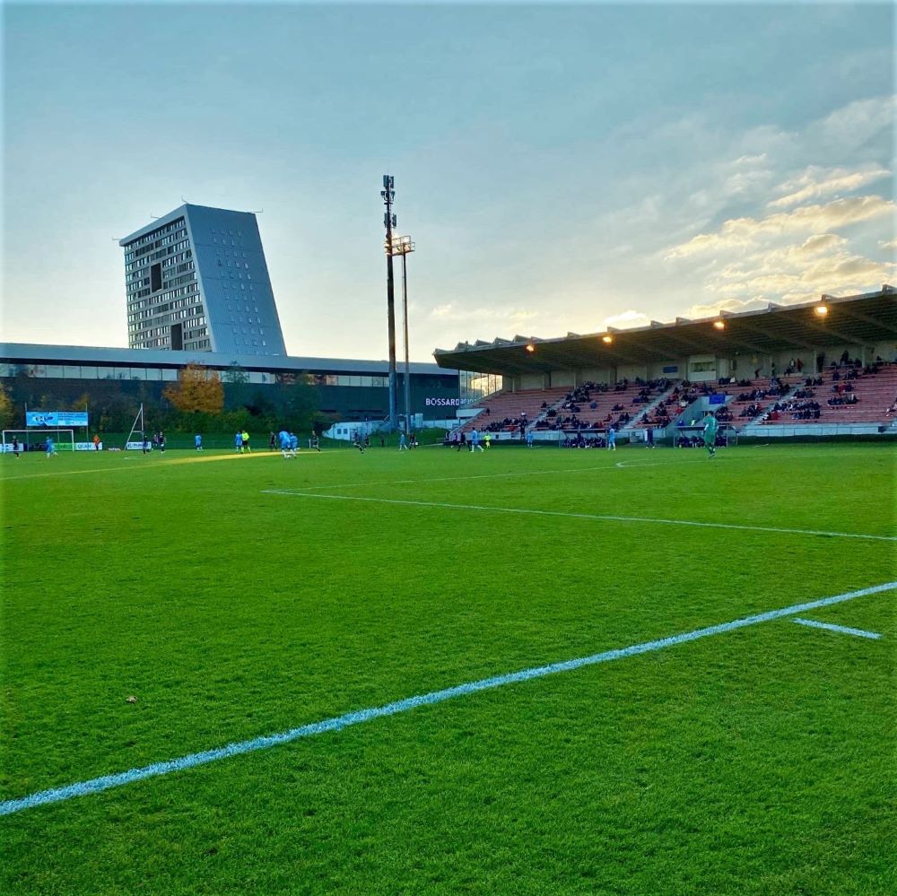 Witzigerweise lag das Kantonsgericht – leider nicht mit einer touristischen Hinweistafel zu Boris Becker versehen – direkt auf meinem Weg vom Bahnhof zum Zuger Fußballstadion. Die Herti Allmend, Heimat des Fußballclubs Zug 94, ist nur 1.000 Meter vom 2003 grundlegend modernisierten Bahnhof entfernt und liegt im Schatten von Zugs höchstem Gebäude (das 63 Meter hohe Uptown-Hochhaus) und einer großen und modernen Eishalle (Bossard Arena). Das Fußballstadion wurde 1979 eröffnet und ist ein typischer Zeitzeuge jener Epoche der Stadionarchitektur. Die große Betonhaupttribüne mit Funktionstrakt im Bauch erinnert dabei an zeitgenössische Pendants aus Deutschland (ich denke gerade an Remscheid, Lüdenscheid oder Baunatal).