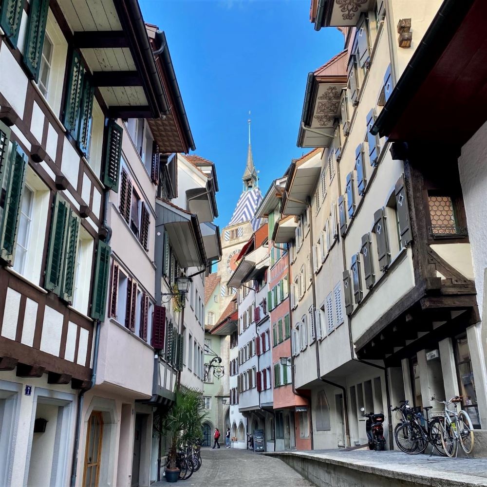 Pünktlich um 14 Uhr erreichte ich Zürich und von dort ging es nun mit einem Regionalzug weiter nach Zug. Die Hauptstadt des gleichnamigen Kantons betrat ich gegen 14:30 Uhr und hatte nun rund 90 Minuten für einen Stadtspaziergang. Da in Zug nur ungefähr 30.000 Menschen leben und der historische Stadtkern sehr überschaubare Ausmaße hat, konnte ich dennoch alle bekannten Sehenswürdigkeiten begutachten. Die Gassen der Altstadt verlaufen im Prinzip noch so, wie sie bei der Stadtgründung im 13.Jahrhundert angelegt wurden. Es existieren mit der Untergasse (siehe Titelbild) und der Obergasse zwei Hauptstraßen im historischen Kern, die in Nord-Süd-Richtung verlaufen. Eine dritte Parallelstraße hatte sich 1435 der Zugersee einverleibt (die heutige Untergasse war also früher die Mittelgasse).