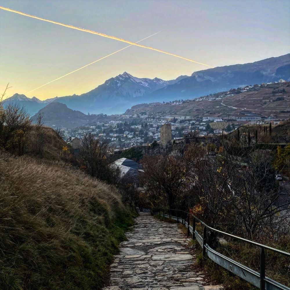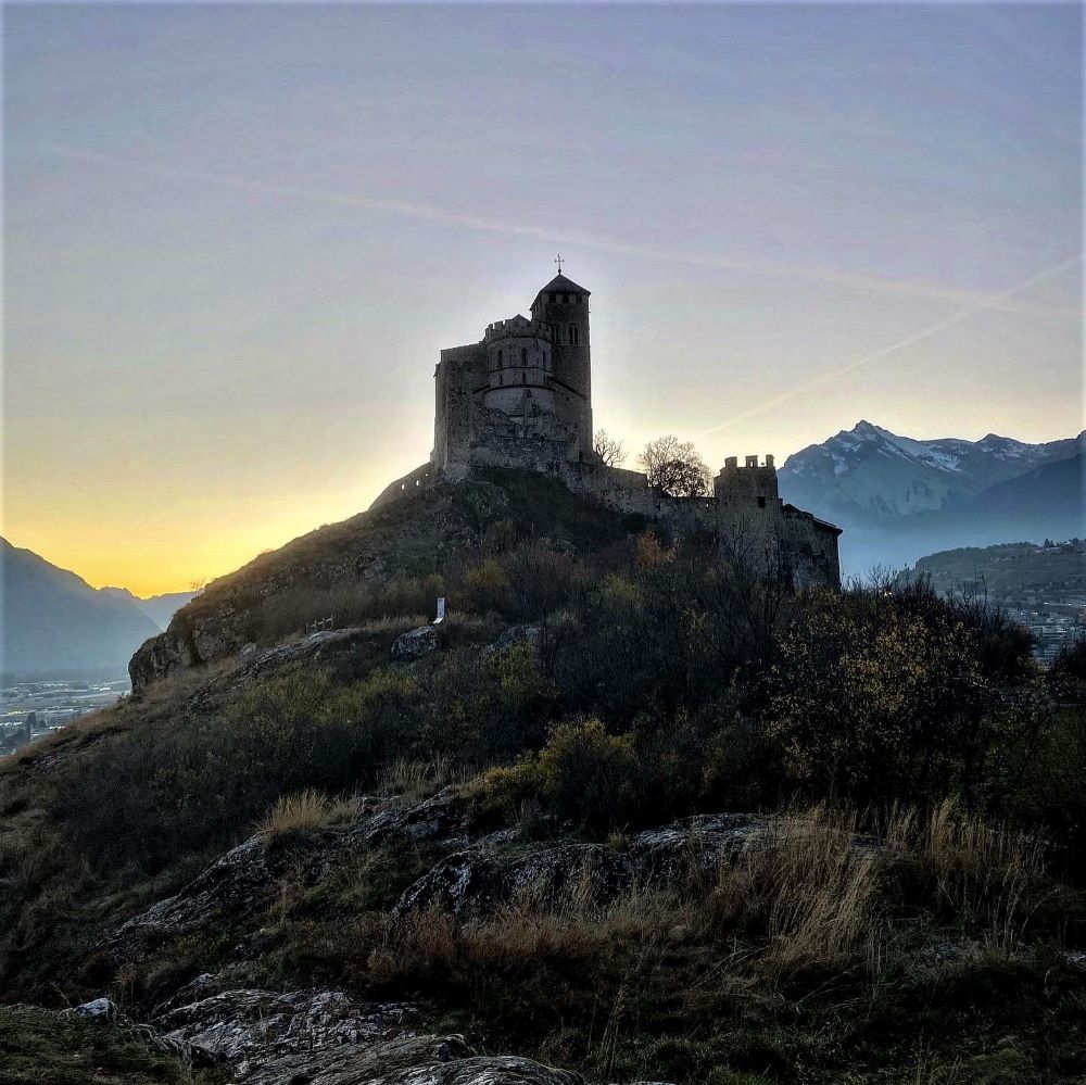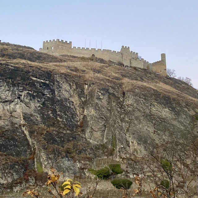 Als das antike Römische Reich und die Zeit der Völkerwanderungen überwunden waren, wurde im Jahr 999 das so genannte Fürstbistum Sitten geschaffen. Dieses wurde 1032 Teil des Heiligen Römischen Reiches Deutscher Nation (HRR) und der Bischof war fortan zugleich ein weltlicher Reichsfürst. 1049 wurden erstmals die Burg und die Basilika von Valeria (Basilique de Valère) urkundlich erwähnt, die bis heute als Wahrzeichen über der Altstadt von Sion thronen. Klar, dass Simon und ich den Valeriahügel erklommen, um uns die hochromanische Basilika und ihre Befestigungsmauern mal aus der Nähe anzuschauen. Zugleich gab es oben eine tolle Panoramasicht mit Gipfeln wie dem 2.969 Meter hohen Haut de Cry.