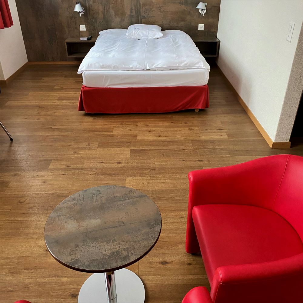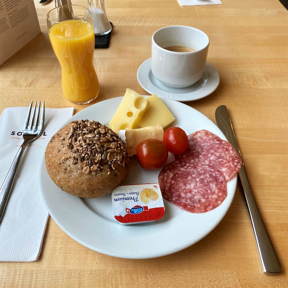 Wenige Sekunden später saß ich im Frühstückssaal und schlemmte mich einmal quer durch’s Programm. Beim Speiseangebot setzt die Hotelgruppe Sorell auf Qualität und Regionalität. Es gab u. a. Emmentaler, Gruyère, Bündnerfleisch, Vallemaggia-Brot, Müsli, Eier und Konfitüren aus Schweizer Produktion. Die meisten Lieferanten waren aufgelistet und es schmeckte alles vorzüglich. Dazu noch Kaffeespezialitäten und frisch gepresste Säfte. Welch formidabler Start in den Tag!
