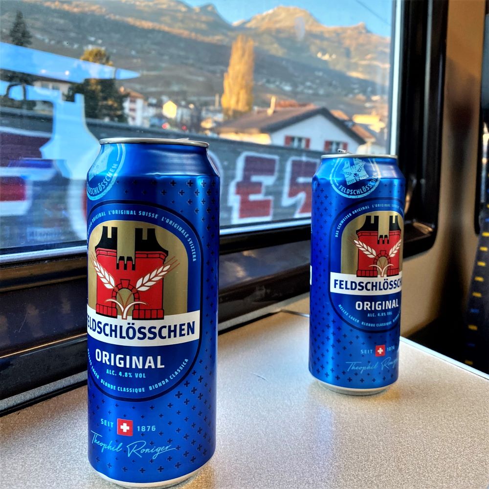 Bei ein paar leckeren Feldschlößchen aus dem schweizerischen Rheinfelden hatten wir uns viel zu erzählen (da Simon bereits seit 6,5 Jahren in der Schweiz lebt, lag die letzte Begegnung schon etwas zurück). Außerdem erreichte uns die Breaking News, dass sich ein Anfangsverdacht gegen Werder Bremens Trainer erhärtet hatte. Die Zusammenarbeit wurde am heutigen Morgen beendet, da der Bremer Chefcoach mit einem gefälschten Impfpass betrogen haben soll. Ansonsten genossen wir die reizvolle Aussicht auf der NEAT (Neue Eisenbahn-Alpentransversale) und für einen Nerd wie mich war mein erstmaliges Durchqueren des Lötschberg-Basistunnels fast noch besser als das Bergpanorama. Mit 34,6 km ist es der fünftlängste Eisenbahntunnel der Welt und in jenem Tunnel passierte unser Zug nebenbei auch den imaginären Röstigraben, der die deutschsprachige von der französischsprachigen Schweiz trennt. Am Tunnelende sahen wir also bereits den Himmel über dem Canton du Valais (Kanton Wallis). Allerdings ist das Wallis, anders als z. B. die Kantone Vaud (Waadt) oder Genève (Genf), zweisprachig. Während circa 63 % das Französische als Umgangssprache pflegen, sind rund 28 % der Bürger deutsche Muttersprachler. So ist auch Visp, wo wir den Zug für einen Umstieg verlassen mussten, mehrheitlich deutschsprachig.