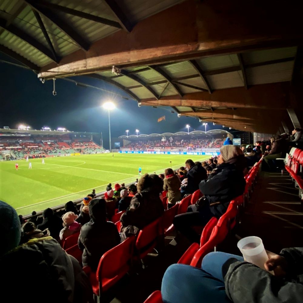 15 Minuten vor Anpfiff erreichten wir schließlich das Stade de Tourbillon und hatten erstmal einiges zu meckern. Der Einlass ging zwar trotz zusätzlicher Zertifikats- und Ausweiskontrolle flott, doch beim Catering wurden wir enttäuscht. Ich meinte irgendwann mal gelesen zu haben, dass es in Sion Raclette im Stadion gibt und war voller Vorfreude auf dieses käsige Vergnügen. Aber ich irrte. Stattdessen wurden nur Hot Dogs und Süßkram offeriert, was weder Simon, noch mich kulinarisch abholen konnte. Auch mit dem Bier haderten wir zunächst. Es gab nur Heineken (33 cl für 4 CHF), doch trocken bleiben war natürlich auch keine Option. Deshalb ging es mit der ersten von insgesamt vier Runden Bier auf die Tribüne.