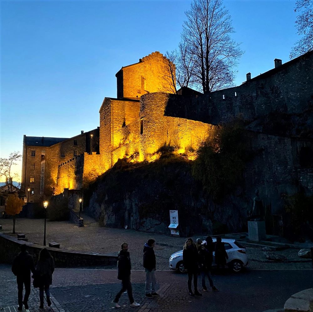 Residieren tat der Fürstbischof allerdings ab 1373 (und bis 1798) im Château de Tourbillon, welches im 13.Jahrhundert auf dem Nachbarhügel errichtet wurde und zugleich der Namenspatron des hiesigen Fußballstadions ist. Jenes Stade de Tourbillon lag nun hell erleuchtet zu unseren Füßen und die ersten Zuschauer auf den Rängen erinnerten uns daran, dass bald Anstoß sein würde und die Zeit leider nicht mehr für den Besuch der Burgruine Tourbillon reicht. Aber weil es auch für die sozio-politische Entwicklung der Schweiz von Relevanz ist, erwähne ich gerne noch, dass der Fürstbischof seine Residenz 1798 nicht freiwillig aufgab, sondern die Französische Revolution seinerzeit auf das Territorium der heutigen Schweiz übergriff und im Wallis ein weltliches Regime errichtet wurde. Zunächst wurde aus dem Fürstbistum die unabhängige Republik Wallis, welche Napoleon Bonaparte jedoch schon 1810 als Département du Simplon in sein Franzosenreich eingliederte.