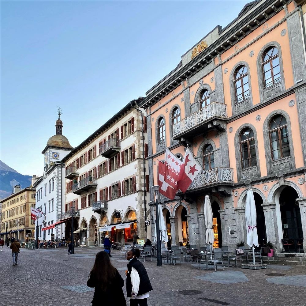 In Visp stand auf dem Nachbarperron schon unser Zug nach Sion bereit und ca. 20 Minuten später hatten wir unseren Zielort erreicht. Nun hatten wir noch 90 Minuten bis zum Anpfiff und nutzten dieses Zeitfenster für einen Stadtspaziergang. Sion mit seinen ca. 35.000 Einwohnern ist Hauptort des Kantons Wallis und liegt auf über 500 Metern ü. NN am Lauf der Rhône. Nördlich des Flusses haben in diesem Tal schon die Kelten (Stamm der Seduner) gesiedelt, ehe 15 v. Chr. die Römer die Region unterwarfen. Das Römische Reich wollte so die Kontrolle über die Alpenpässe wie den Grossen Sankt Bernhard erlangen. Nicht, dass nochmal irgendwelche antiken „Nafris“ ungestört mit Elefanten rüberkommen oder diese ungepflegten germanischen Zottel plötzlich den kürzesten Weg zur sonnigen Südseite der Alpen für sich entdecken…