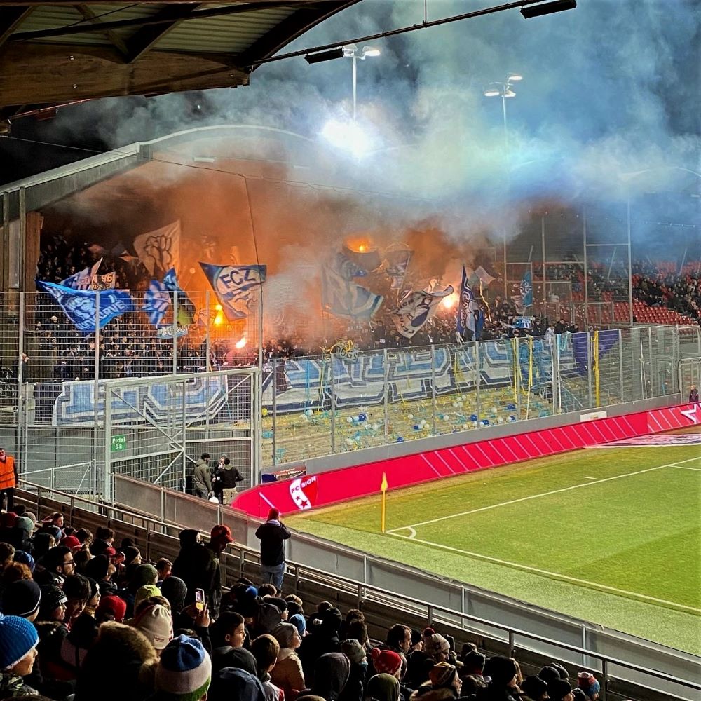 Kaum am Platz, musste ich sofort das Bier abstellen und mein Smartphone zücken. Denn der Heimfanblock zündete bereits fünf Minuten vor Spielbeginn etliche Bengalische Fackeln, die alsbald von Rauchtöpfen in den Vereinsfarben abgelöst wurden. Zum Anpfiff wurde der sehr gut gefüllte Gästeblock ebenfalls optisch aktiv. Sie hatten ein großes Banner mit “FC Zürich”-Schriftzug am Zaun befestigt und im Block waren etliche Fahnen, Doppelhalter und Luftballons im Einsatz. Dazu wurden auf Kommando noch Kassenrollen in blau, weiß und gelb geworfen. Anschließend gingen auch hier zahlreiche Leuchtfeuer an. Ein sehr gelungenes Gesamtkunstwerk!