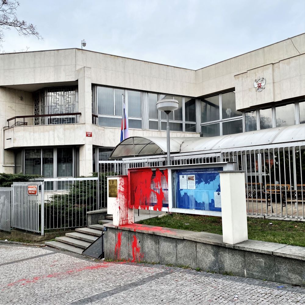 Okay, bei Russland bröckelt das Mantra gerade ein wenig. Vielleicht hat Vladimir Vladimirovich mittlerweile doch den Bogen überspannt? Sahen jedenfalls ein paar tschechische Bürger so und haben die Mauern der russischen Botschaft mit kritischen Parolen verziert. Auch hat die Botschaft einige Farbbeutel abbekommen und die Farben der Ukraine wurden prominent in die Nachbarschaft der russischen Diplomaten gepinselt.