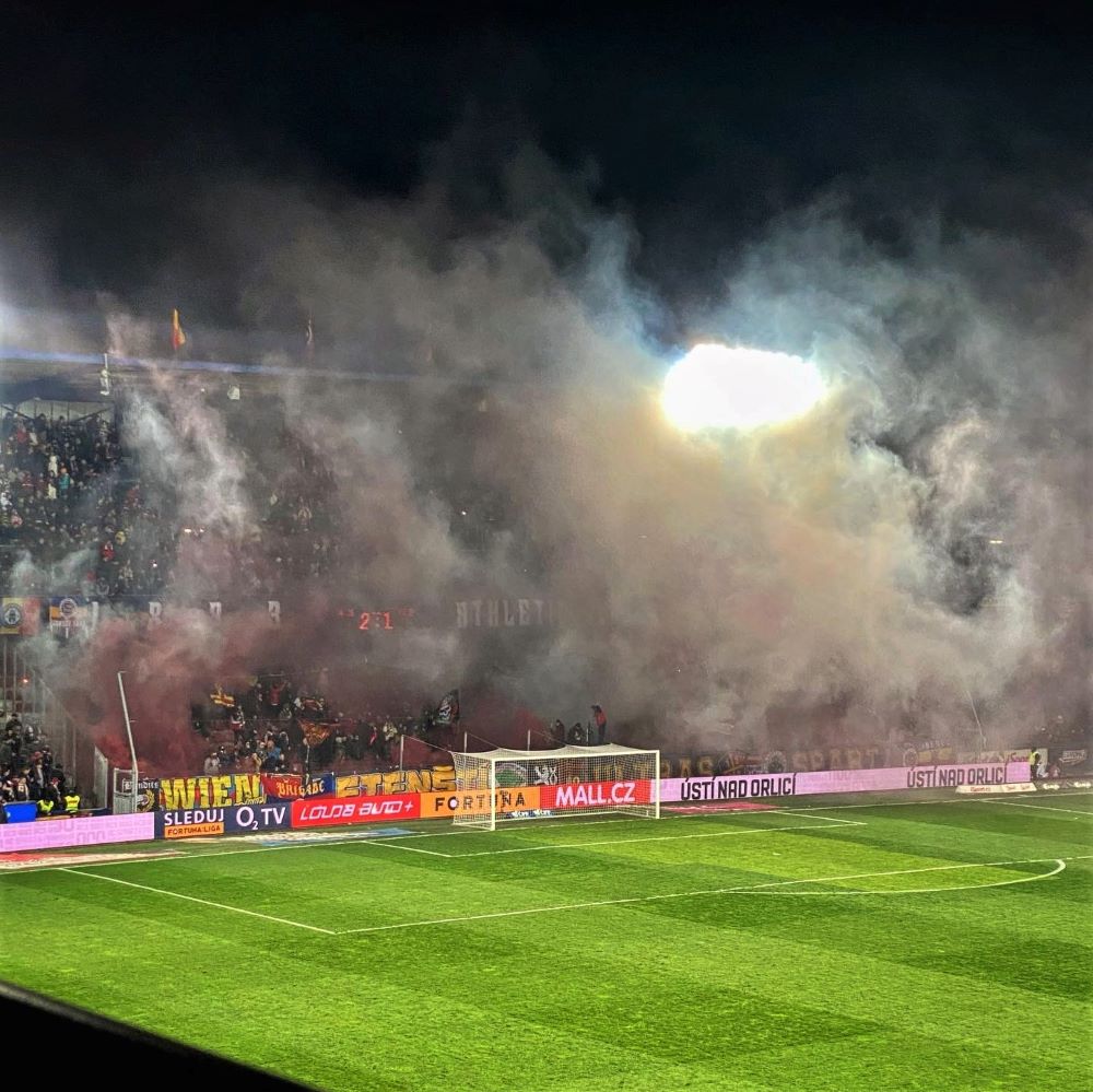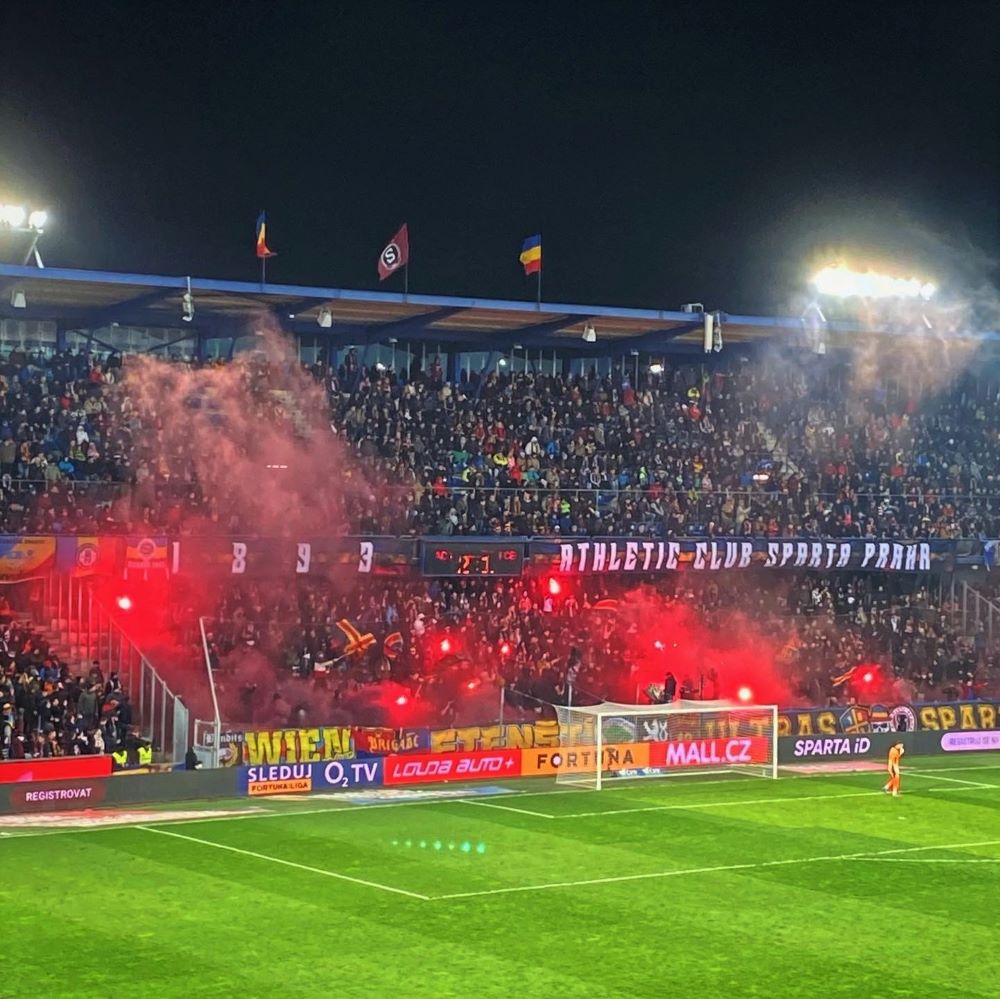 Die Chachaři (schlesisch umgangssprachlich für Vagabund, Schurke o. ä.) hatten obendrein früh etwas zu feiern. Bereits in der 8.Minute ging der FC Baník durch ein Kopfballtor von Innenverteidiger Jaroslav Svozil in Führung. Sparta, als Tabellendritter noch mit Meisterambitionen, bemühte sich jedoch um eine schnelle Antwort und die gelang in der 16.Minute. Ein Kopfball von Tomáš Čvančara prallte gegen die Torlatte und sein Sturmpartner Adam Hložek konnte erfolgreich abstauben. Das ganze übrigens kurz nach der Choreographie der Ultras Sparta. Gab Folienbahnen, Tafeln und ein großes Banner in blau und rot. Auf dem Banner stand „Pražská Sparta“ (Prager Sparta) und unter den Folien wurden ein paar pyrotechnische Blinklichter entzündet. Die kamen jedoch kaum zur Geltung.