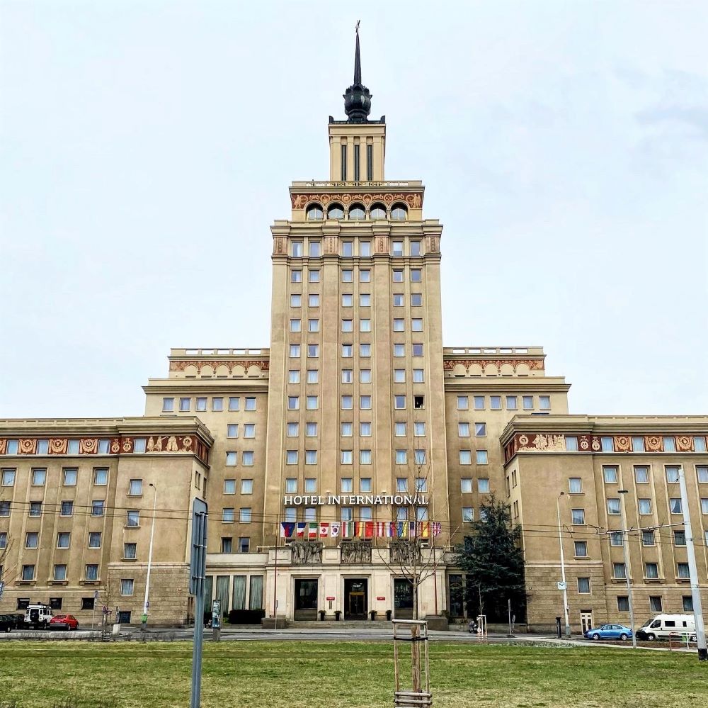 Nachdem wir auf dem Stadionvorplatz von Dukla die Fußabdrücke diverser Vereinslegenden und eine Statue von Josef Masopust begutachtet hatten (knapp 400 Pflichtspiele für Dukla, 63 A-Länderspiele für die Tschechoslowakei und 1962 zu Europas Fußballer des Jahres gekürt), kamen wir am Hotel International vorbei. Dieses 1956 im Stile des Sozialistischen Realismus (Zuckerbäckerstil) fertiggestellte Hotel ist so’n richtiger Stalinstachel, der über 278 Gästezimmer verfügt und dessen roter Stern in 88 Metern Höhe über dem Bauwerk thront. Ursprünglich unter dem Namen Hotel Družba als Militärhotel vom Verteidigungsministerium projektiert, wurde es kurz nach der Eröffnung doch in ein öffentliches Luxushotel umfunktioniert und in Hotel International umbenannt.