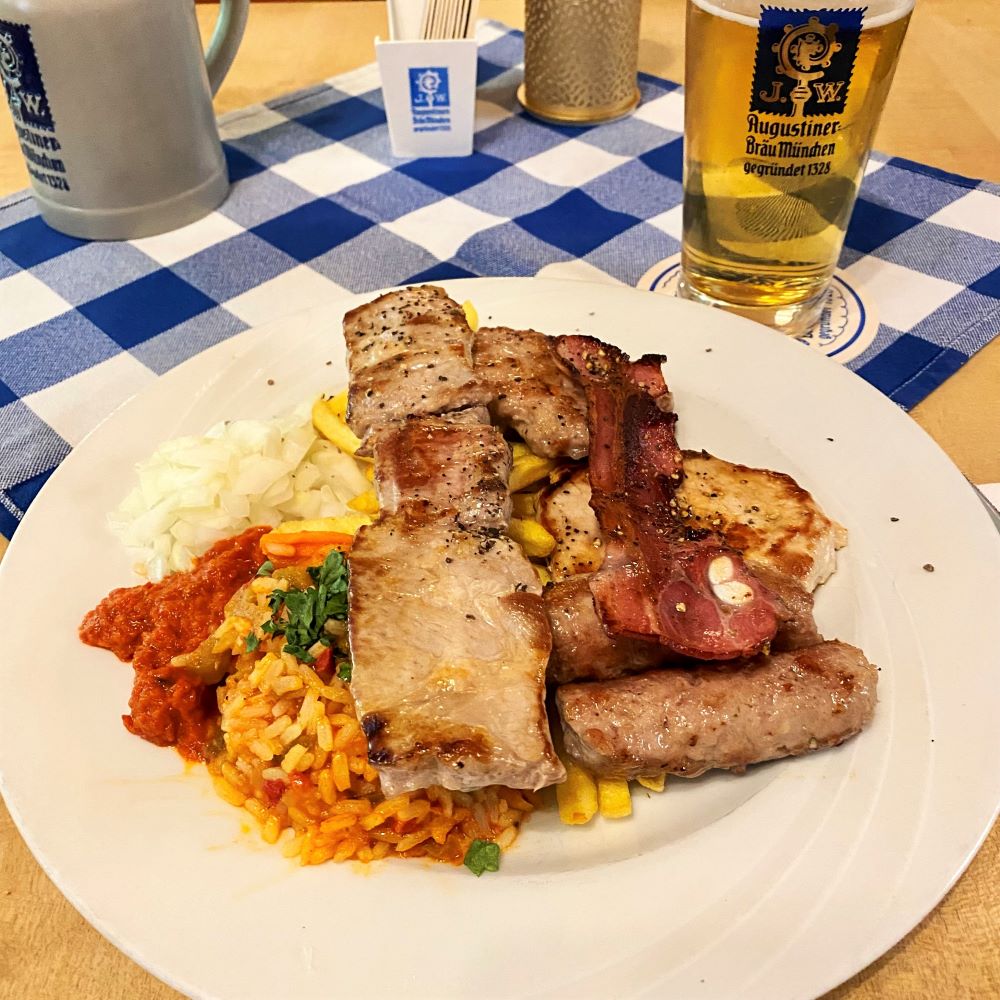 Nach Spielende zog es mich schleunigst in mein Hotelumfeld zurück. Ich wollte endlich was essen, dann einchecken und danach ein bisschen die Füße hochlegen. Eigentlich plante ich mir lediglich was auf die Faust zu holen, damit der Magen nicht mehr knurrt. Am späteren Abend könnte ich ja nochmal richtig Essen gehen… Aber es obsiegte doch die Gier. Nachdem ein weiteres großflächiges Wandbild von WON (und Loomit) in Bahnhofsnähe begutachtet wurde (diesmal war Hitler-Attentäter Georg Elser das Motiv), lachte mich nebenan das Restaurant Bavaria an. Neben bayrischer Küche standen auch Balkanklassiker vom Grill in der Speisekarte. Kein Wunder, wenn der Wirt auf den Namen Branko hört. Der Grillteller mit Ćevapčići, Ražnjići, Pljeskavica, Schweinerückensteak, Speckstreifen, Đuveč, Ajvar, Zwiebeln und Pommes frites war lecker und wunderbar sättigend. Kostete auch lediglich 12,90 €, was mir für München arg günstig vorkam. Dazu gab es noch ein fassfrisches Augustiner Helles für 3,70 € und ich war erstmal glücklich.