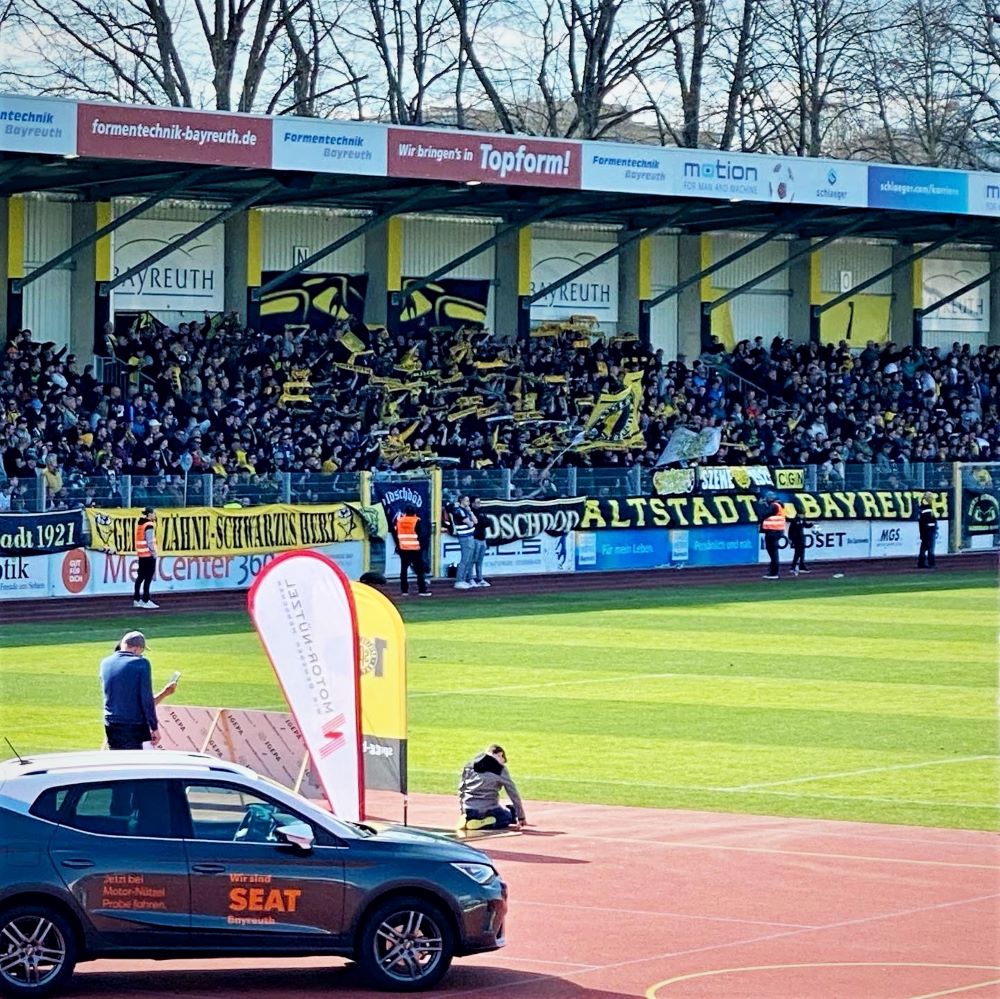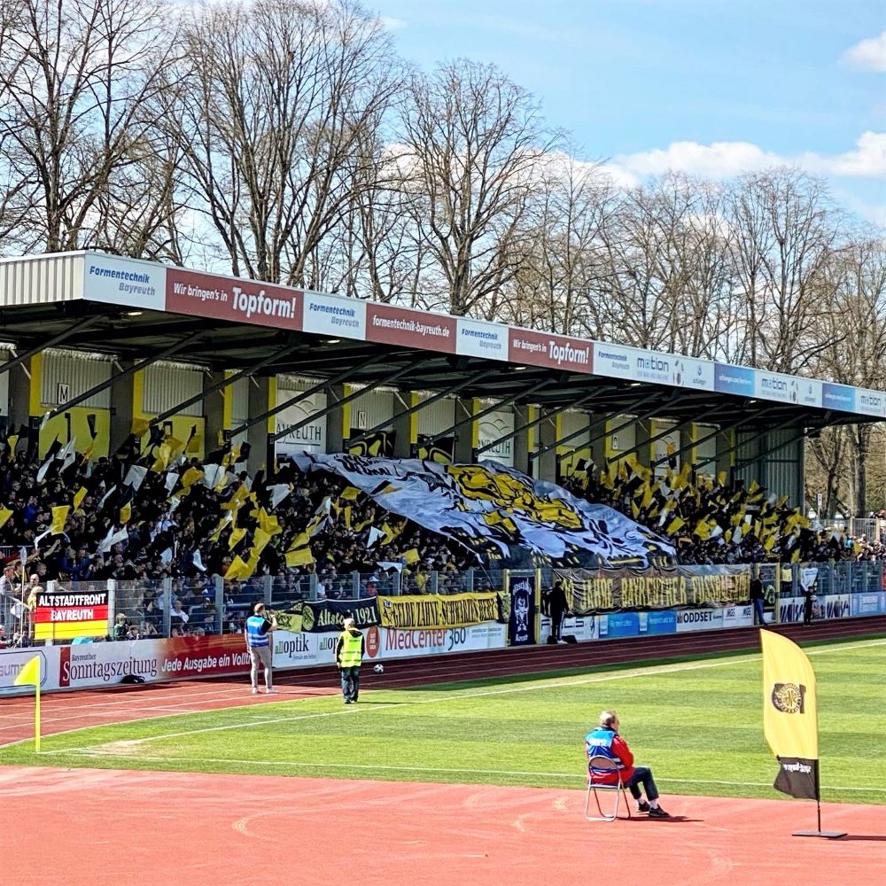 Auch die Fanszene der SpVgg hatte für das große Spiel etwas vorbereitet. Unter dem Motto „100 Jahre Bayreuther Fußballkult“ (die SpVgg Bayreuth wurde am 23.Juli 1921 als Turn- und Sportverein Altstadt gegründet) zogen sie eine Blockfahne im Fanblock hoch, die von Fähnchen in den Vereinsfarben flankiert wurde. Seit 1945 firmieren die Altstädter als SpVgg Bayreuth, aber der Name Altstadt (bzw. Oldschdod im lokalen Idiom) für den Club hat sich erhalten. Er prangt auf vielen Zaunfahnen und Fanartikeln und man geht umgangssprachlich nicht zur Spielvereinigung, sondern zur Oldschdod.