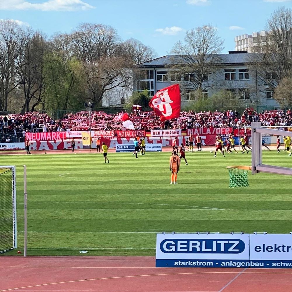 Beim Einheizen auf das Spiel hatte nicht nur der Stadionsprecher ähnlich viel Pathos wie das Opus von Richard Wagner, nein sogar der Ritt der Walküren dröhnte aus den Boxen. „Mit dem Geruch von Napalm am Morgen“ wurde nun zwar nicht gedient, aber ich liebe jenen von Rauchpulver eh viel mehr. Diesbezüglich schaffte der Gästeblock Abhilfe. Die Fans und Freunde der FC Bayern Amateure hatten nicht nur rote und weiße Folienbahnen zu Spielbeginn hochgezogen, sondern auch Rauchpulver in diesen Farben entzündet. Um die 1.000 Schlachtenbummler standen in der Gästekurve und ihr Auftritt war aller Ehren wert.