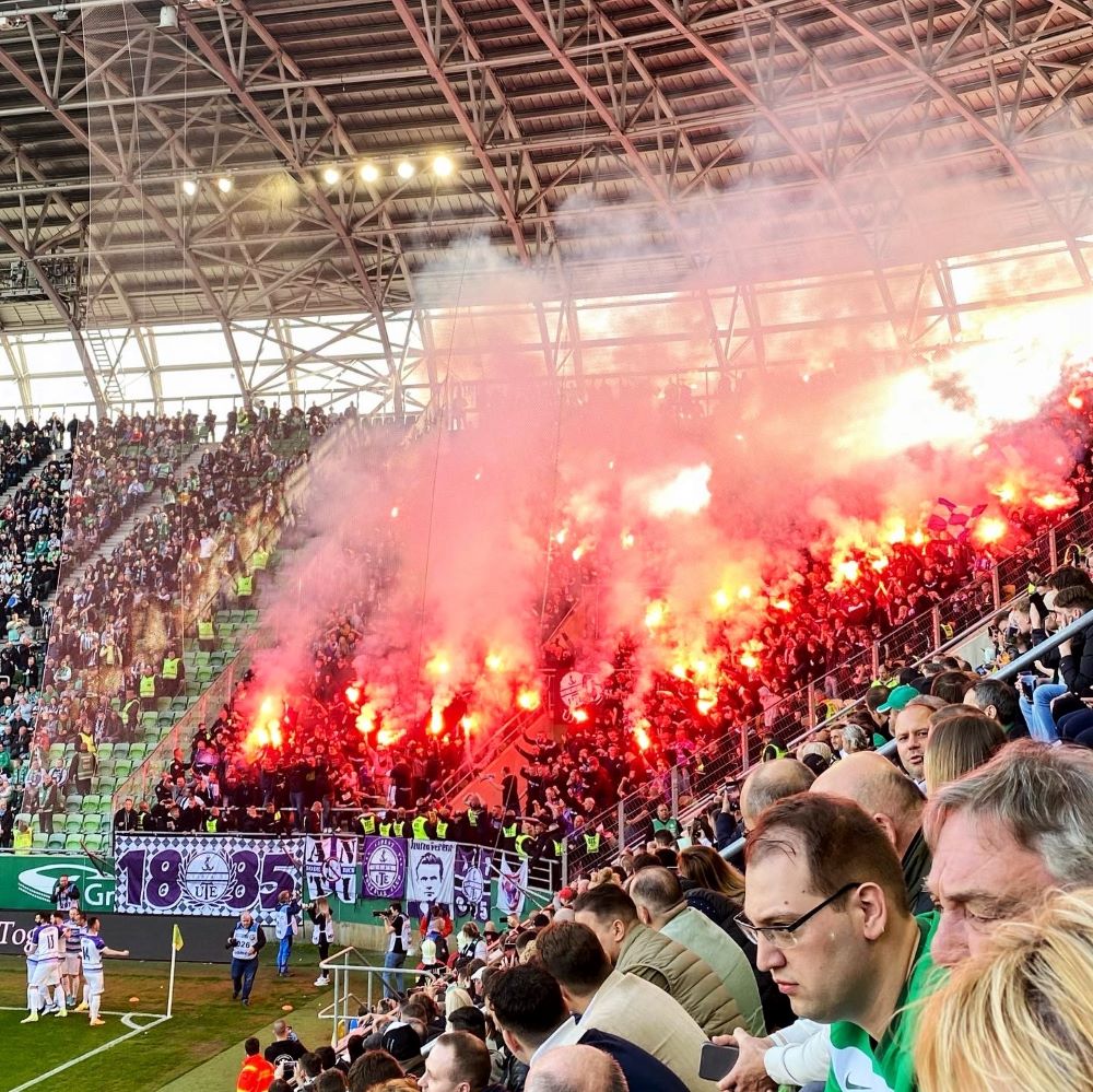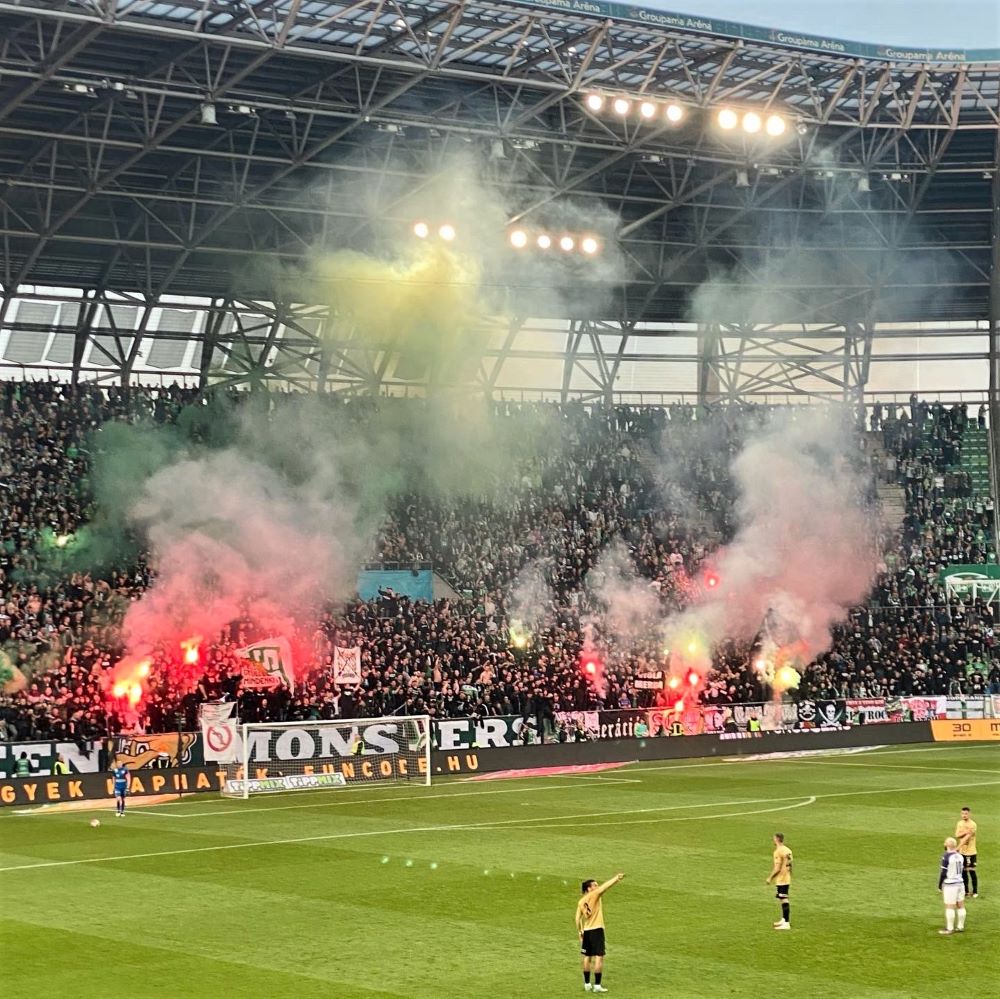 Der Anhang von Újpest fackelte derweil erstmalig etwas Pyrotechnik ab und konnte diese Beschäftigung in der 6.Minute nochmal intensivieren. Der Schiedsrichter hatte kurz zuvor auf den Punkt gezeigt und der georgische Mittelstürmer Budu Zivzivade hatte die Gäste aus dem Norden von Pest früh in Führung gebracht. Als er und seine Mitspieler zum Gästeblock liefen, brannte dieser natürlich lichterloh. Es blieb äußerst stimmungsvoll auf den Rängen und die Mannschaft in den grün-weißen Dressen drängte auf den Ausgleich. Zu sehr war man gewillt die im Prinzip feststehende Meisterschaft hier und heute im großen Derby fix zu machen.