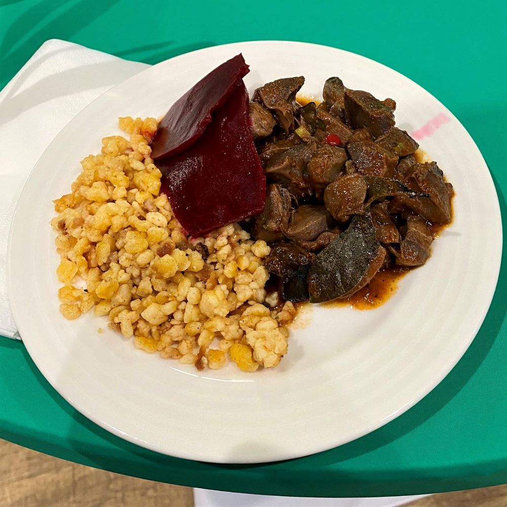 Dann ging es an die Hauptgänge, von denen ich wenigstens drei probieren wollte (insgesamt waren es fünf Optionen). Beim ersten Gang gab es ein pikantes Ragout (mit sehr feiner Estragonnote) aus zarten Hühnerkaumägen mit Eiernockerln und Roter Beete als Beilage. Danach folgte ein Schweinebraten mit geschmortem Rotkohl und Kartoffelpüree. Auch das Truthahngeschnetzelte nach Brasover Art mit leckeren Röstkartoffelecken wollte ich unbedingt probieren und bereute es nicht. Für die mit Frischkäse und Kräutern gefüllten Hähnchenschenkel (mit Risi Bisi) sah ich dann vorerst keinen Platz mehr im Magen und die Pasta in Käsesauce wollte ich den Vegetariern lassen (gewisse kulinarische Identitäten scheinen es ähnlich schwer wie bestimmte sexuelle Orientierungen in Ungarn zu haben).