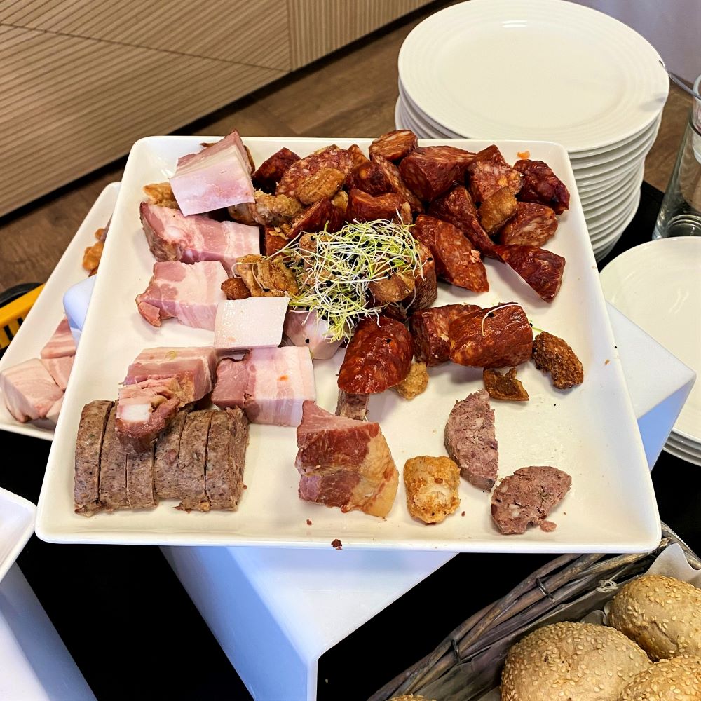 Womit wir optimal zum Fußball überleiten können. Denn nach sieben Stunden Sightseeing machte ich mich gegen 15 Uhr nochmal im Hotel frisch, streifte mir einen Anzug über und sollte mir wenig später den Bauch bis zur Schmerzgrenze vollschlagen. Heute war ich nämlich einer dieser ganz besonderen Stadionbesucher, die freundlich in einem Foyer von Hostessen emfangen werden und ein goldenes Bändchen um das Handgelenk bekommen. Mit dem Fahrstuhl ging es anschließend zwei Etagen höher, um sich dort an einer reichen Auswahl an Speisen und Getränken zu laben. Im Bewusstsein der drohenden Völlerei hatte ich seit dem Frühstück gefastet und stürzte mich nun mit Verve auf die Vorspeisen. Wursthappen vom Mangalica-Schwein, geräucherter Speck, Griebenschmalz, Grützwurst und eine reichhaltige Käseauswahl standen bereit. Die kalte Kirschsuppe war mir jedoch als Intermezzo zu den Hauptgängen etwas suspekt und daher ließ ich mir lieber Hähnchenstreifen in Honig-Senf-Marinade und gebackenen Camembert mit Salatbouquet servieren.
