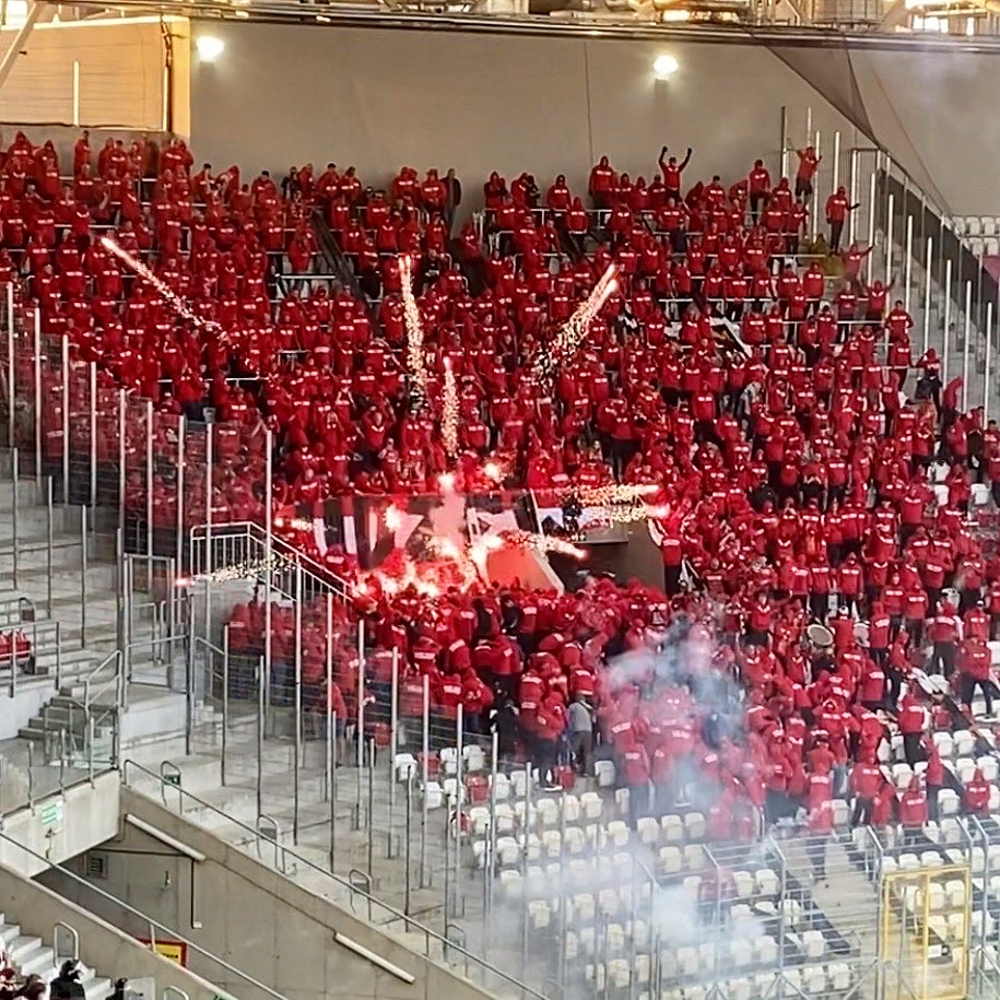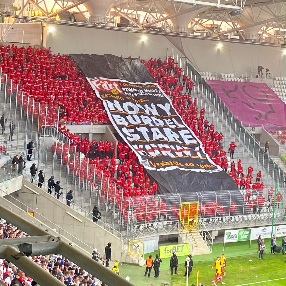 Derweil wollte auch Widzews Anhang die geplante Fanaktion nachholen. Doch gerade als sie ihre mitgebrachtes Material wieder zu platzieren begannen, netzte Bartłomiej Pawłowski in der 80.Minute für Rot-Weiß-Rot. Der blonde Offensivspieler kletterte sogleich auf ein Fluchttor des Gästeblocks und ließ sich von den Fans feiern. Die waren emotional nun wieder obenauf und ließen dem Torjubel sogleich ihre angepinselten Folienbahnen folgen. Diese ergaben zusammen das Titelblatt einer Boulevardzeitung und für die Schlagzeile „NOWY BURDEL, STARE KURWY“ benötigte nicht mal ich ein Wörterbuch. Neues Bordell, aber die alten Huren, lautete ihr nachträgliches Grußwort zur Stadionfertigstellung des verhassten Lokalrivalen. Jenes Titelblatt wurde natürlich noch von Pyrotechnik flankiert und euphorisiert begleitete man die Mannschaft in die Schlußphase.