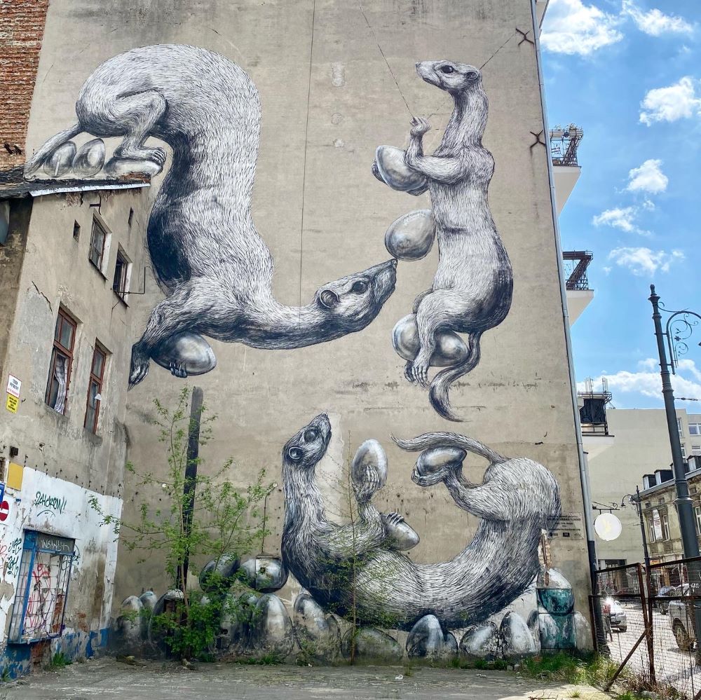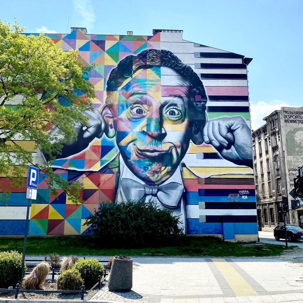 9:46 Uhr war Abfahrt in Warszawa-Zachodnia und 10:59 Uhr stieg ich in Łódź-Fabryczna aus dem Zug. Eigentlich wollte ich nun ins Muzeum Sztuki w Łodzi und mir dort zeitgenössische Kunst anschauen. Jedoch war dieses Museum feiertagsbedingt geschlossen. Zum Glück ist die ganze Innenstadt von Łódź eine riesige Kunstgalerie unter freiem Himmel und ich kam mittels Flanieren genauso auf meine Kosten. Das ist schon top, was in Łódź an den Fassaden für Meisterwerke auf den Besucher warten. Begeistert mich jedes Mal auf’s Neue. Insgesamt über 70 „offizielle“ Wandbilder von namhaften nationalen und internationalen Künstlern wie Proembrion, M-City, Etam (alle Polen), Os Gêmeos, Eduardo Kobra, Nunca (alle Brasilien) INTI (Chile), Aryz (Spanien), Vhils (Portugal), Roa (Belgien) oder Remed (Frankreich) gibt es zu entdecken.