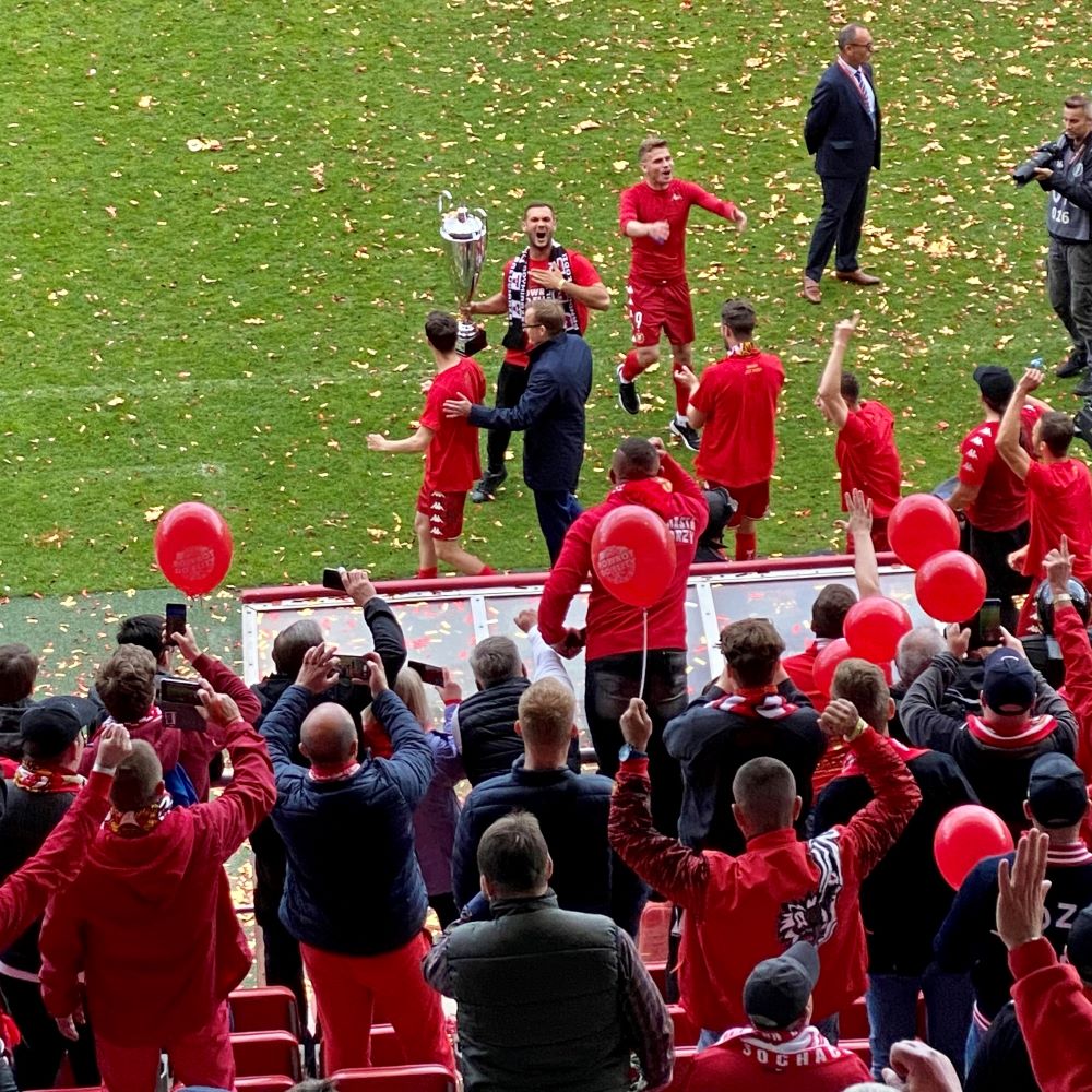 Um 14:37 Uhr erlöste der Unparteiische Bartosz Frankowski schließlich die Mannschaft, den Trainer, den Betreuerstab, alle weiteren Funktionsträger und jeden Fan von Widzew. Abpfiff! Aufstieg! Auf den Rängen gab es sofort kein Halten mehr und ein Großteil der Anhänger flutete das Rasenviereck. Man ließ die Fans kurz feiern und erste Erinnerungsfotos schießen, bat aber per Durchsagen das Feld bei Zeiten wieder zu räumen, damit die Mannschaft auf dem Rasen auch von offizieller Seite als Aufsteiger geehrt werden kann. Der Bitte wurde entsprochen und 14:53 Uhr regnete es Konfetti und Luftschlangen. Das war auch der Startschuss für den zweiten Platzsturm und diesmal standen binnen kurzer Zeit fast alle 18.000 Fans auf dem Grün (siehe Titelbild).