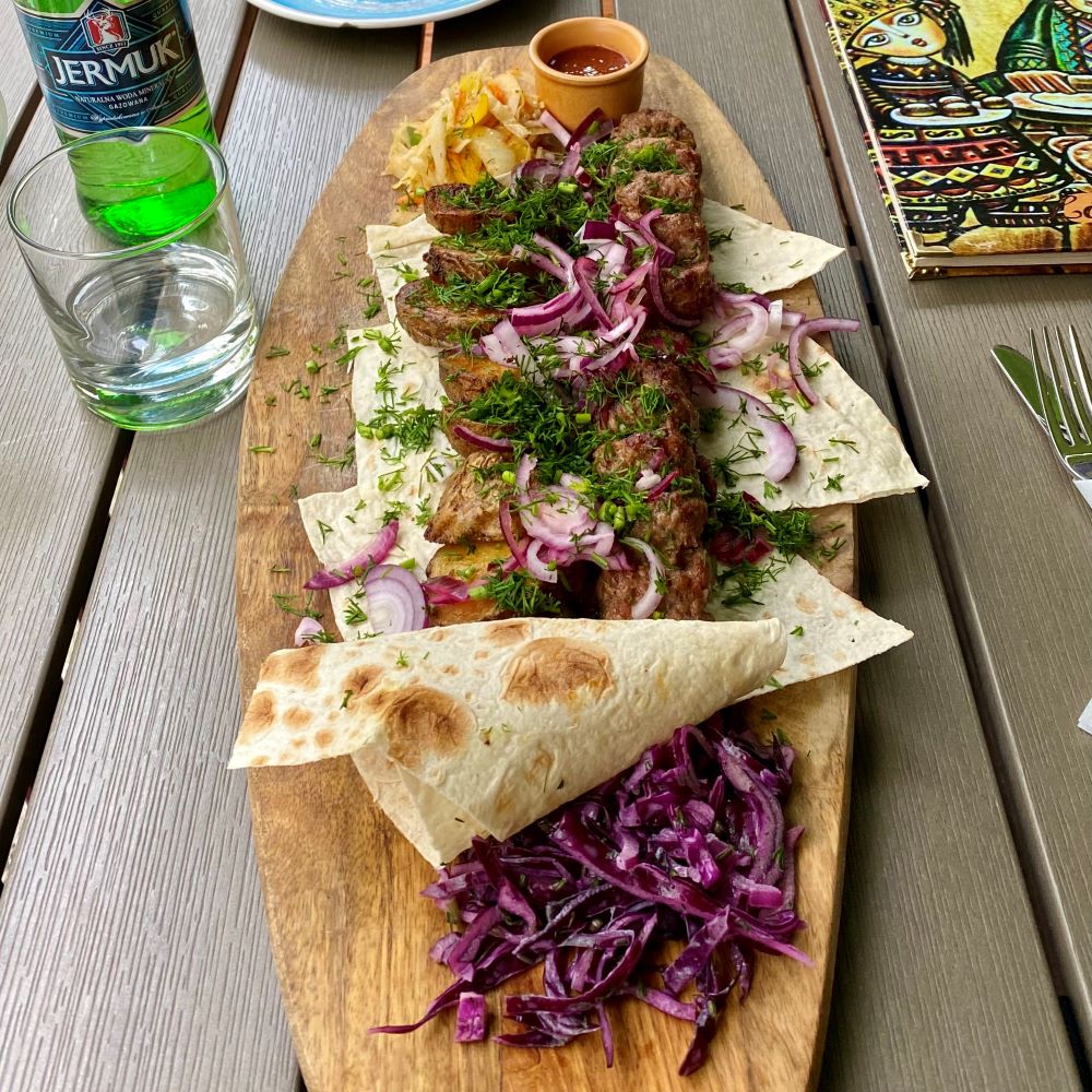 Für mich sollte sich dagegen zwei Stunden nach Spielende ein kulinarischer Kreis schließen. Vor drei Wochen konnte ich meinen geplanten Besuch im armenischen Restaurant Lavash nicht realisieren, weil das Lokal mittags noch nicht geöffnet hatte. Das sah heute in den frühen Abendstunden anders aus und nach einem Spaziergang vom Stadion in die Innenstadt – der sich auf knapp 5.000 Metern logischerweise ganz schön in die Länge zog – durfte ich mich gegen 17 Uhr im Restaurant bzw. auf dessen Außenterrasse platzieren. Ich gönnte mir einen großen Lammhackspieß vom Grill mit Lavash (dünnes Fladenbrot), Röstkartoffen und Salat. Dazu noch ein feinperliges armenisches Mineralwasser namens Jermuk (alles zusammen umgerechnet 15 € inklusive 9,6 % Trinkgeld).