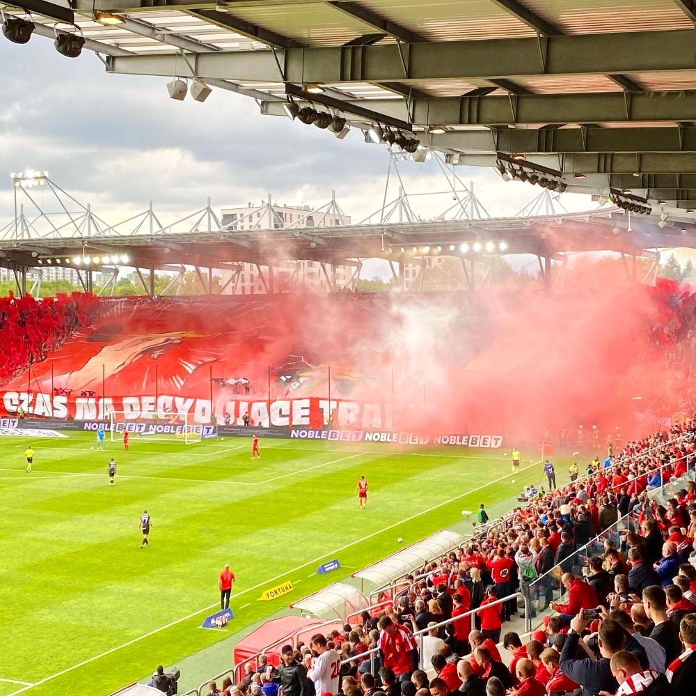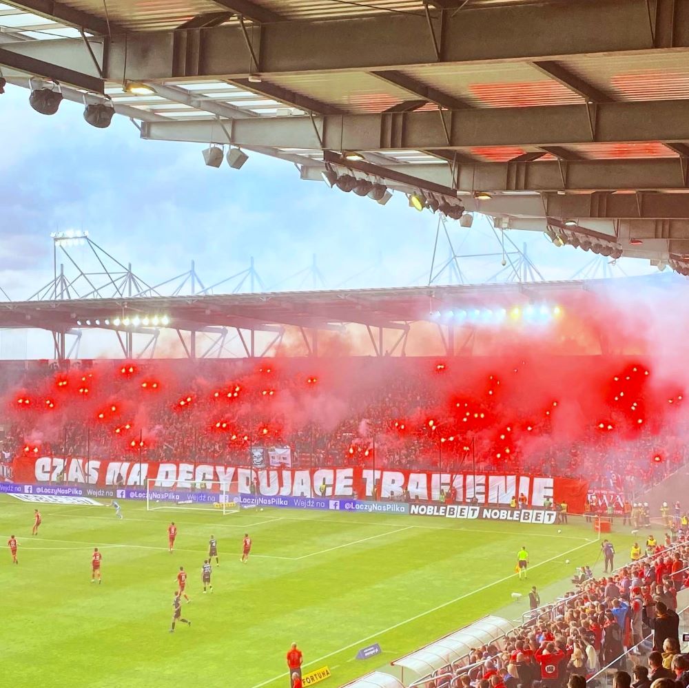 Der Fankurve oblag es wie immer diese einzigartige Stimmung zu orchestrieren und mit choreographischen Aktionen ferner für das gewisse Etwas zu sorgen. Kurz nach Spielbeginn nahm man sich sogleich auf einer riesigen Blockfahne den Dartsport zum Motiv einer Kurvenshow. Die Felder der Scheibe waren allerdings mit Fußballligen anstatt mit Punktzahlen überschrieben. In den seit dem Zwangsabstieg in die 5.Liga (2015) per Aufstieg erreichten Ligen steckten bereits Dartpfeile. Unter dem Motto „CZAS NA DECYDUJĄCE TRAFIENIE“ (Zeit für den entscheidenden Treffer) sollte der letzte Flight nun in das noch jungfräuliche Feld mit der Überschrift Ekstraklasa gehen.