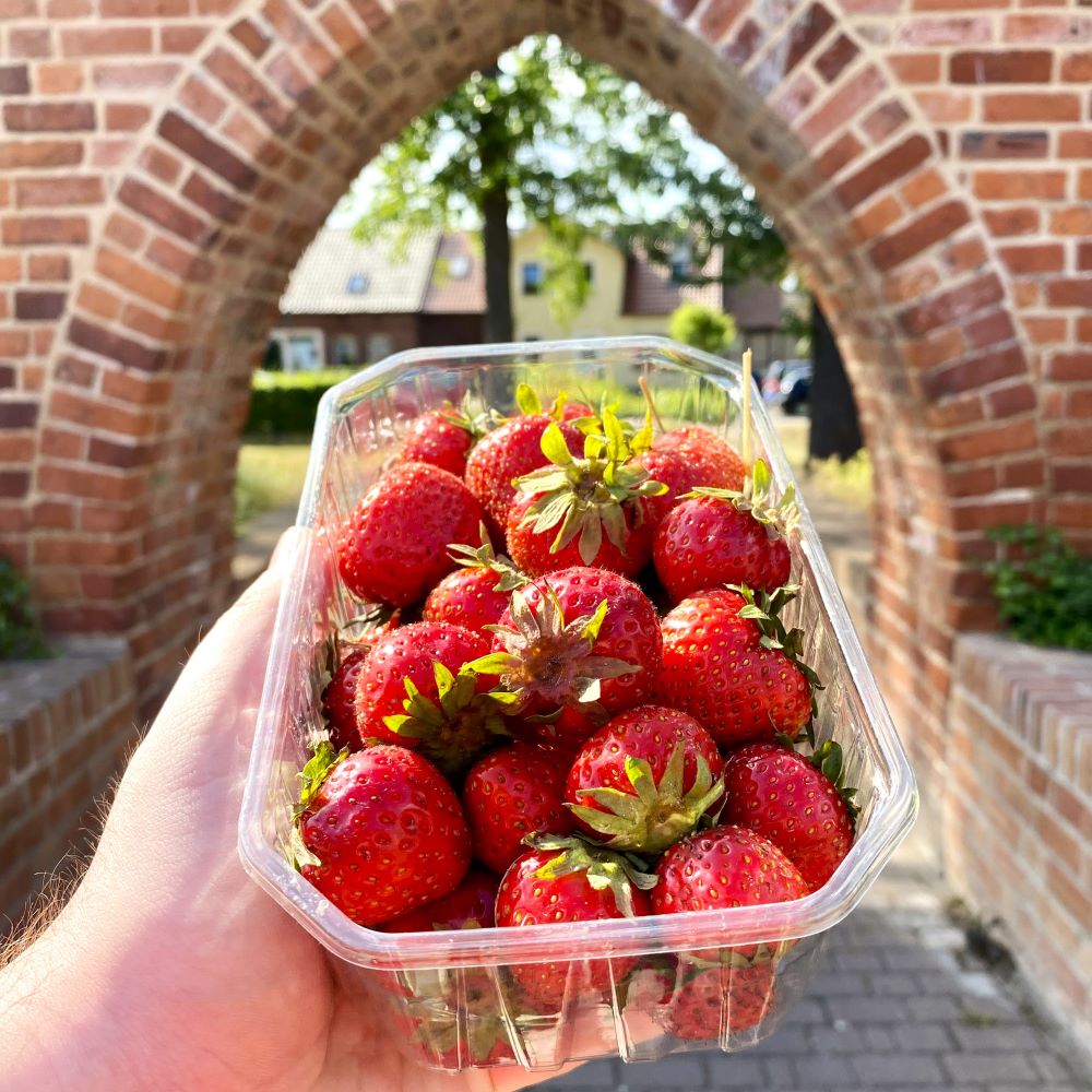 Anschließend hatte ich nochmal 45 Minuten für einen zweiten Stadtspaziergang. Vor dem Spiel konnte ich binnen 90 Minuten schließlich noch nicht alle Sehenswürdigkeiten abhaken. Das Tangermünder Rathaus, das Neustädter Tor und die Lange Fischerstraße mit ihren zahlreichen Fachwerkwerkhäusern aus dem 17. und 18.Jahrhundert mussten sich bis zum späten Nachmittag gedulden. Am Ende meines Rundgangs nahm ich mir noch ein halbes Kilogramm frisch geerntete Erdbeeren aus der Altmark mit und um 17:25 Uhr verließ ich Tangermünde wieder. Wie schon auf der Hinfahrt habe ich die Fahrzeit zum Schreiben des Berichts der Wernigerode-Tour genutzt und um 20:02 Uhr war ich zurück in Hildesheim.
