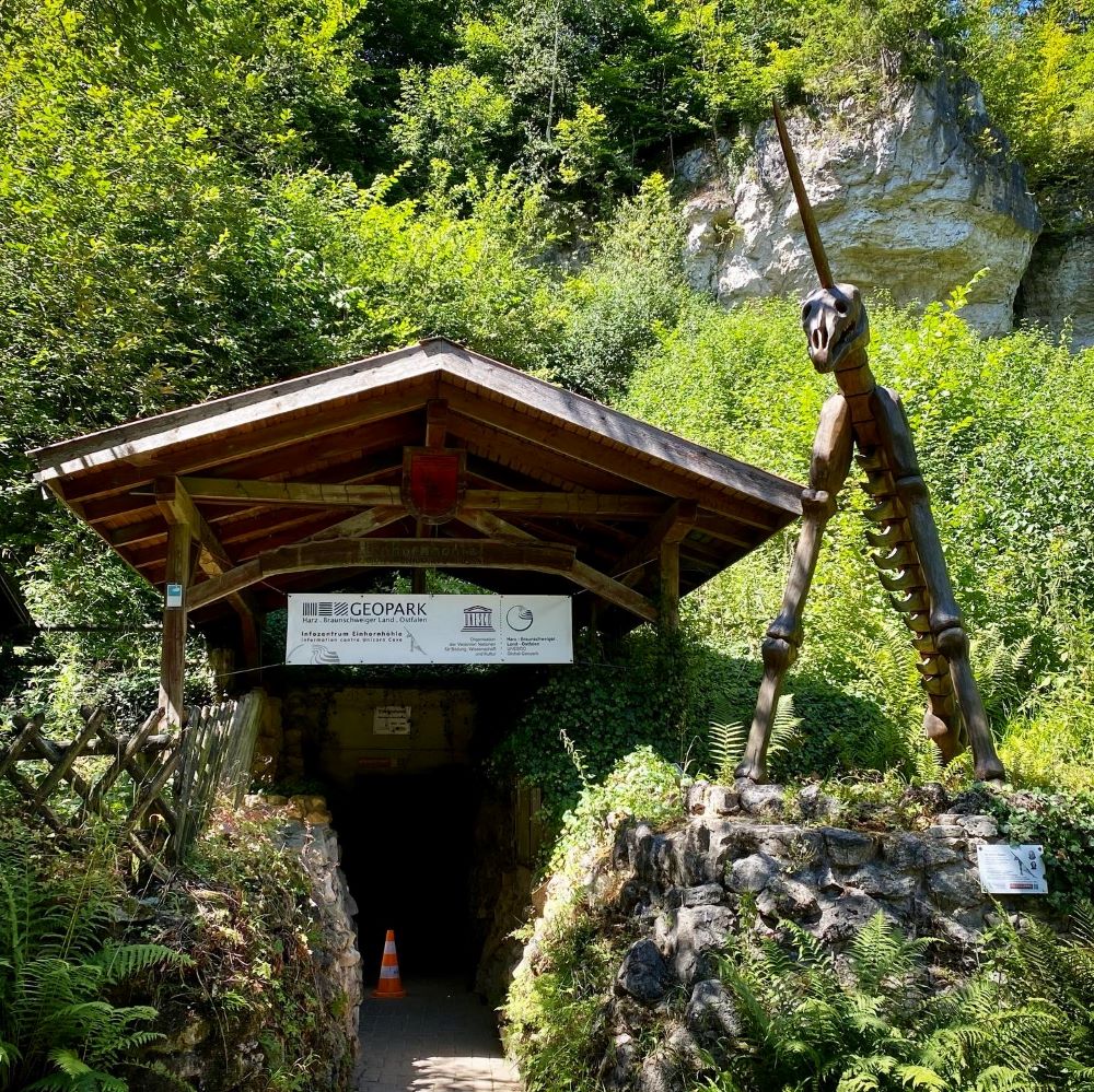 Die nächste Stempelstelle war nur 1,2 km von der Burgruine entfernt, aber dabei ging es zunächst 60 Höhenmeter abwärts ins Hasenwinkeltal und dann wieder 60 Höhenmeter hinauf. Entsprechend des Streckenprofils hatte ich für die ersten 3 km des Tages eine Stunde benötigt. Immerhin gab es nun bereits den zweiten Stempel ins Sammelheft. Dieser war am Eingang der so genannten Einhornhöhle montiert. Dies ist mit 700 Metern Länge die größte Höhle des Westharzes. Ihren Namen bekam die Höhle durch Knochenfunde, die im 17.Jahrhundert sogar der renommierte Otto von Guericke als Einhorngebeine interpretierte. Gottfried Wilhelm Leibniz rekonstruierte außerdem 1686 anhand der Beschreibungen von Otto von Guericke ein Einhornskelett.