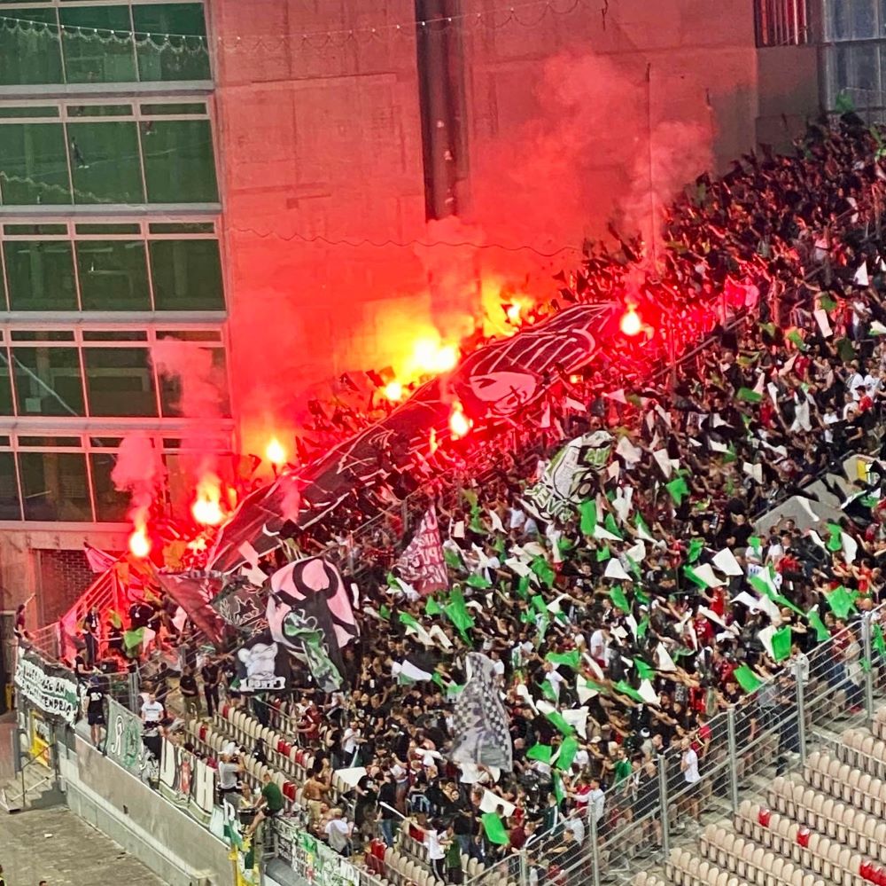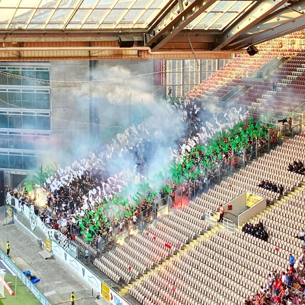Ein weiteres Banner richtete sich wenig später gegen den Einstieg der Pacific Media Group beim 1.FC Kaiserslautern (welche im Frühjahr 10 % der Clubanteile erwarb). Die PMG ist auch bei den Clubs FC Barnsley (England), KV Oostende (Belgien), AS Nancy (Frankreich), Esbjerg fB (Dänemark), FC Den Bosch (Niederlande) und FC Thun (Schweiz) beteiligt und scheint ein europaweites Netz mit Clubs aus der zweiten oder dritten Reihe aufzubauen. Da wird es wie bei ähnlichen Konstrukten (Vgl. Zürich 02/2022) um sehr unromantische Ziele gehen. Außerdem machten die pfälzischen Fans noch Stimmung gegen den FIFA World Cup Qatar 2022. Auf einem Spruchband rechneten sie vor, dass pro 90 Minuten WM-Fußball ca. 300 Menschen auf den Baustellen des Emirats ihr Leben ließen. Bei dem Thema sind hoffentlich viele Fans sensibilisiert. Klar, es werden immer noch genug Menschen die Scheiße am TV verfolgen und ein paar Dullies sogar nach Katar reisen, aber ein merklicher Rückgang der Einschaltquoten wäre z. B. ein wünschenswertes Zeichen.