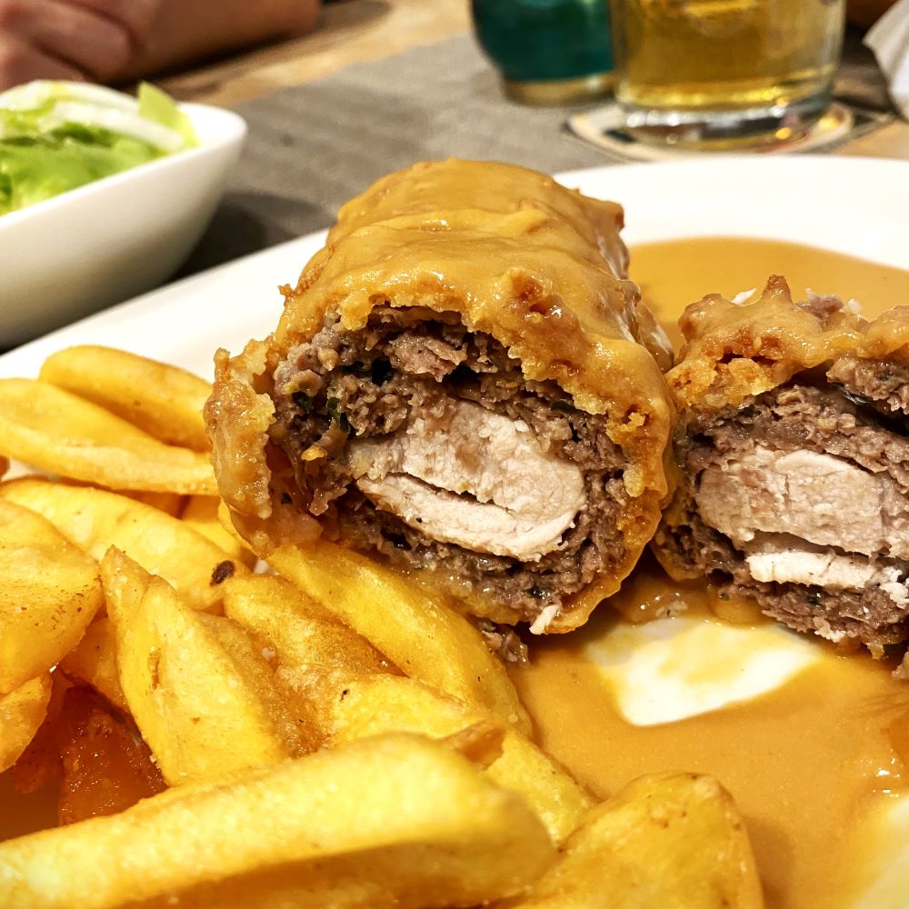 Gegen 18 Uhr verließen wir die Autobahn und steuerten das Städtchen Alzey an. Dort erspähten wir im ersten Verkehrskreisel den Namen Georg Scheu in Beton gegossen. “Bestimmt der Erfinder der Scheurebe” mutmaßte Bene. Tatsache! Der Vater der Scheurebe ist zwar 1879 in Krefeld geboren, wirkte jedoch auf den Weinbergen rund um Alzey und ist hier schließlich 1949 verstorben. Aber tief ins Thema Önologie wollten wir natürlich nicht eintauchen, sondern zeitnah den Hunger stillen. Die Internetrecherche nach Balkanküche zwischen Mainz und Kaiserslautern hatte nämlich das Makarska in Alzeys Stadtzentrum ausgespuckt. Für unsere beiden Mitreisenden mit den kleinen Mägen gab es hier das Topangebot von vier Ćevapčići mit Salat, Zwiebeln und Ajvar im Fladenbrot für 4 €, während Bene auf den Grillteller (17,50 €) setzte und ich mir das das Schnitzel Makarska für 13,50 € gönnte (welches sich als knusprige Schnitzel-Pljeskavica-Rolle entpuppte).