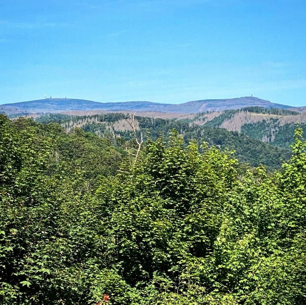 Erst auf den letzten 500 Metern wurde es nochmal eklig. Es mussten weitere 60 Höhenmeter gemeistert werden, zunächst mit 10 %, am Ende mit 18 % Steigung. Doch die Mühen wurden oben auf dem Gipfel des Kummel (536 m ü. NN) belohnt. Der Ausblick in alle vier Himmelsrichtungen war fantastisch. Dafür musste man nicht mal zwingend auf den 1904 errichteten Bismarckturm steigen. Neben dem Turm erwartet den Wanderer außerdem ein Ausflugslokal (also daran mangelte es heute mal nicht), ein Waschbärgehege und natürlich ein Stempelkasten der Harzer Wandernadel. Gegen 15 Uhr war jener Stempel im Sammelheft und ich hoffte noch irgendwie den Zug um 16:19 Uhr in Barbis zu bekommen. Allerdings war das Ziel noch über 7 km entfernt und bei 10 bis 20 % Gefälle auf den nächsten 1,5 km kam ich nicht sonderlich schnell voran (wollte schon aufrecht und nicht rollend unten ankommen).