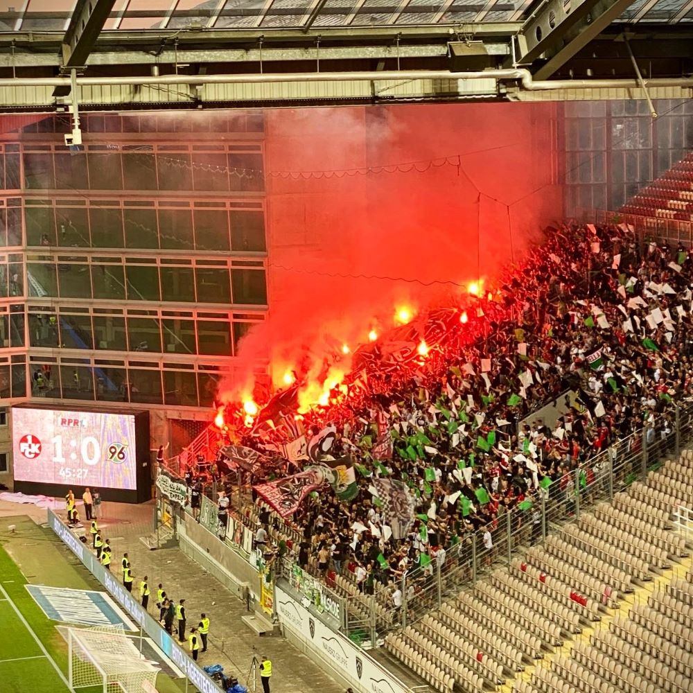 Ich habe meine Fanleidenschaft zwar nie von sportlichen Erfolgen abhängig gemacht, aber ein Auswärtssieg am heutigen Abend wäre natürlich ein positives Signal von 96 gewesen. Am besten man knüpft an den Auswärtssieg 2016 an, als 96 zum Saisonauftakt ebenfalls auf dem Betze gastierte und den Teufeln dabei vier Tore einschenkte (2016/17 war nebenbei die vorerst letzte Saison, in jener ich mehr als null oder ein 96-Spiel im Stadion verfolgt habe). Ich hoffte also auf viele enttäuschte Pfälzer Gesichter um mich herum. Gemeinsam mit denen machte ich jedoch erstmal große Augen, als der Gästebereich seine Choreografie darbot. Fähnchen in den Vereinsfarben und zahlreiche blinkende Pyrotechnik. Dazu das zugegeben eher nichtssagende Banner mit der Parole „Immer voran, immer weiter“. Aber optisch sahen Banner, Fähnchen und Leuchtfackeln natürlich astrein aus.