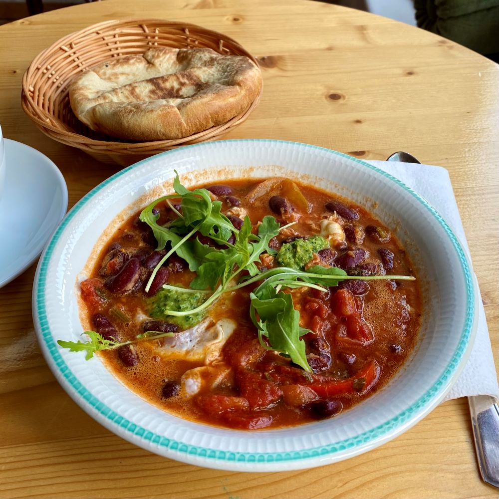 Auf jener Karl-Marx-Allee kehrte ich heute übrigens zum Frühstücken ins Pretty Café Deli ein. Kitschiger Vintage wie dort schreckt mich in Berlin eigentlich eher ab, aber verdächtig guter Geruch zog durch die geöffnete Tür auf das Trottoir des realsozialistischen Prachtboulevards. Nun wagte ich mich doch unter das junge Touristenpublikum und orderte einen großen Cappuccino und eine Portion Shakshuka an der Theke. Die orientalische Tomaten-Eierspeise mit dem frisch aufgebackenen und hausgemachten Pitabrot mundete vorzüglich und die Kaffeespezialität aus der Zweikreiser-Siebträgermaschine war ebenfalls eine Gaumenfreude.