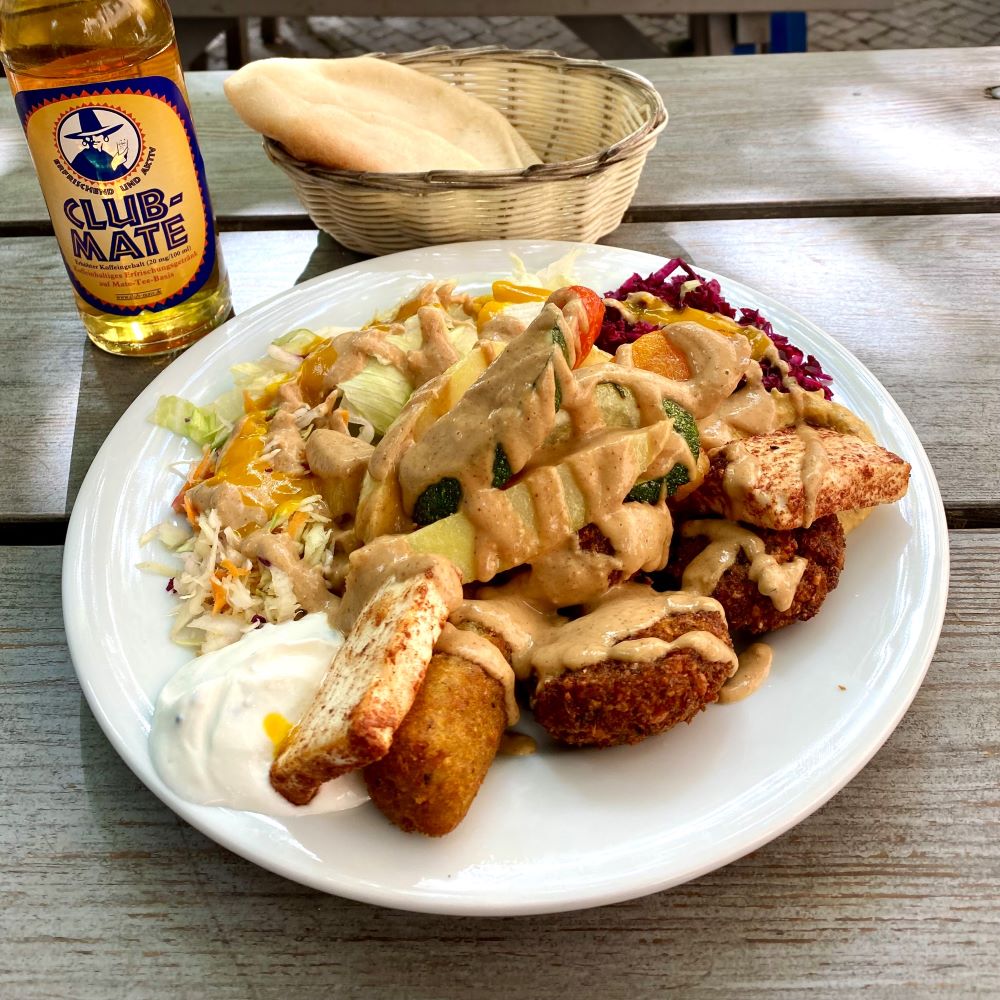 Vom RAW-Gelände zog es mich dann ans Ufer der Spree. Ich spazierte nett am Wasser ostwärts und setzte über die Elsenbrücke nach Alt-Treptow über. Am Flutgraben passierte ich alsbald die ehemalige deutsch-deutsche Grenze und befand mich nun im Kreuzberg. Den quirligen Wrangelkiez hatte ich ob seiner mannigfaltigen Optionen als Ort meines Mittagessens auserkoren. Den Zuschlag bekam letztlich die sudanesische Imbissstube Nil in der Oppelner Straße. Wobei The Hummussapiens gegenüber eigentlich für seinen Namen hätte belohnt werden müssen. Aber der fiel mir erst auf, als ich bereits auf meine gemischte Platte mit u. a. Ful, Falafel, Halloumi, frittiertem Maniok und ganz viel Erdnusssauce wartete. Den Durst löschte dazu ein Fläschchen Club Mate.