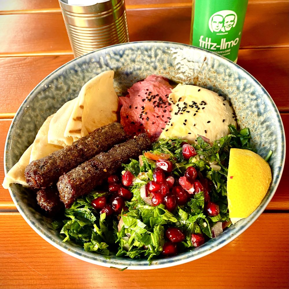 Nach Abpfiff hatte ich nun 2,5 Stunden bis zur Abfahrt meines gebuchten InterCity nach Rostock. Deshalb stoppte ich auf dem Weg zum Hauptbahnhof nochmal in Kreuzberg und machte einem Lokal, welches bereits für das Mittagsessen in der engeren Auswahl war, meine Aufwartung. Nein, immer noch nicht The Hummussapiens… (aber der Ground fällt auch irgendwann!) Bei Fatoush ließ ich mir eine Schale mit Kufta, Petersilien-Granatapfelsalat und zweierlei Hummus und servieren. Dazu ’ne Melonenlimo von Fritz und ich war happy.