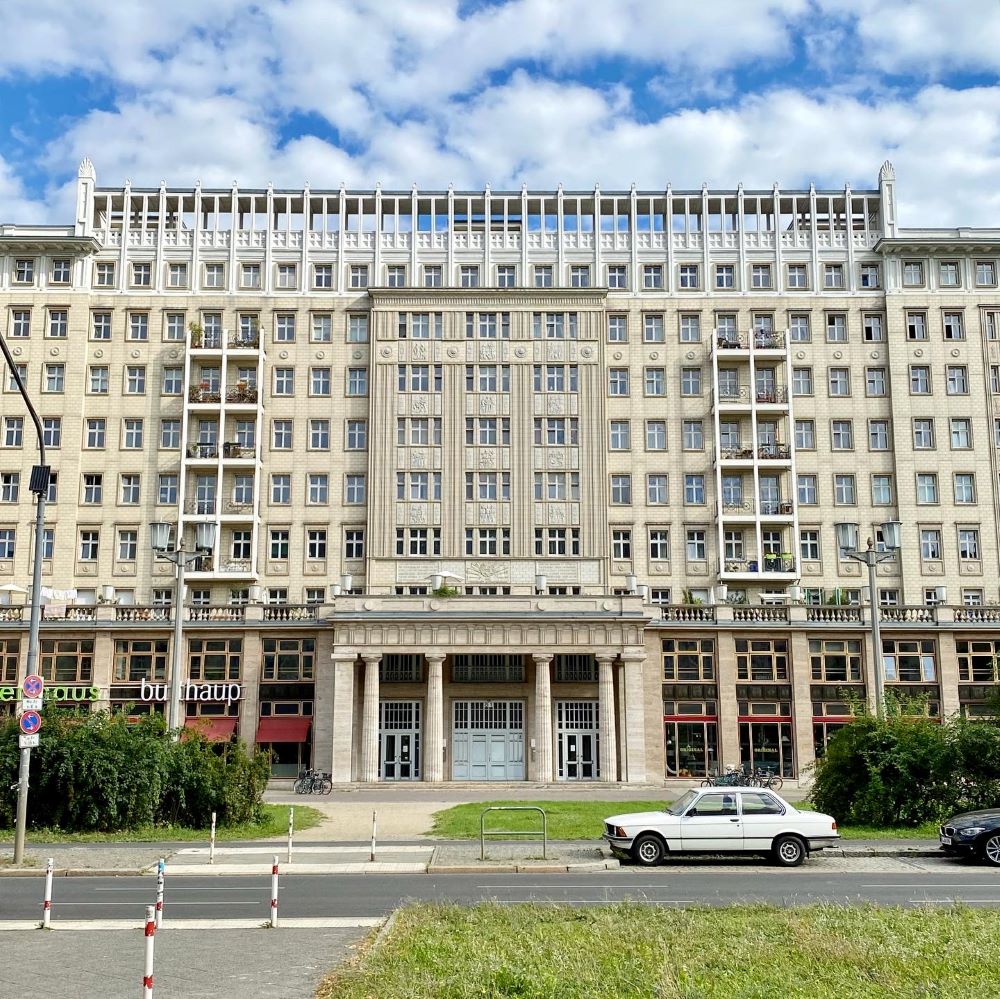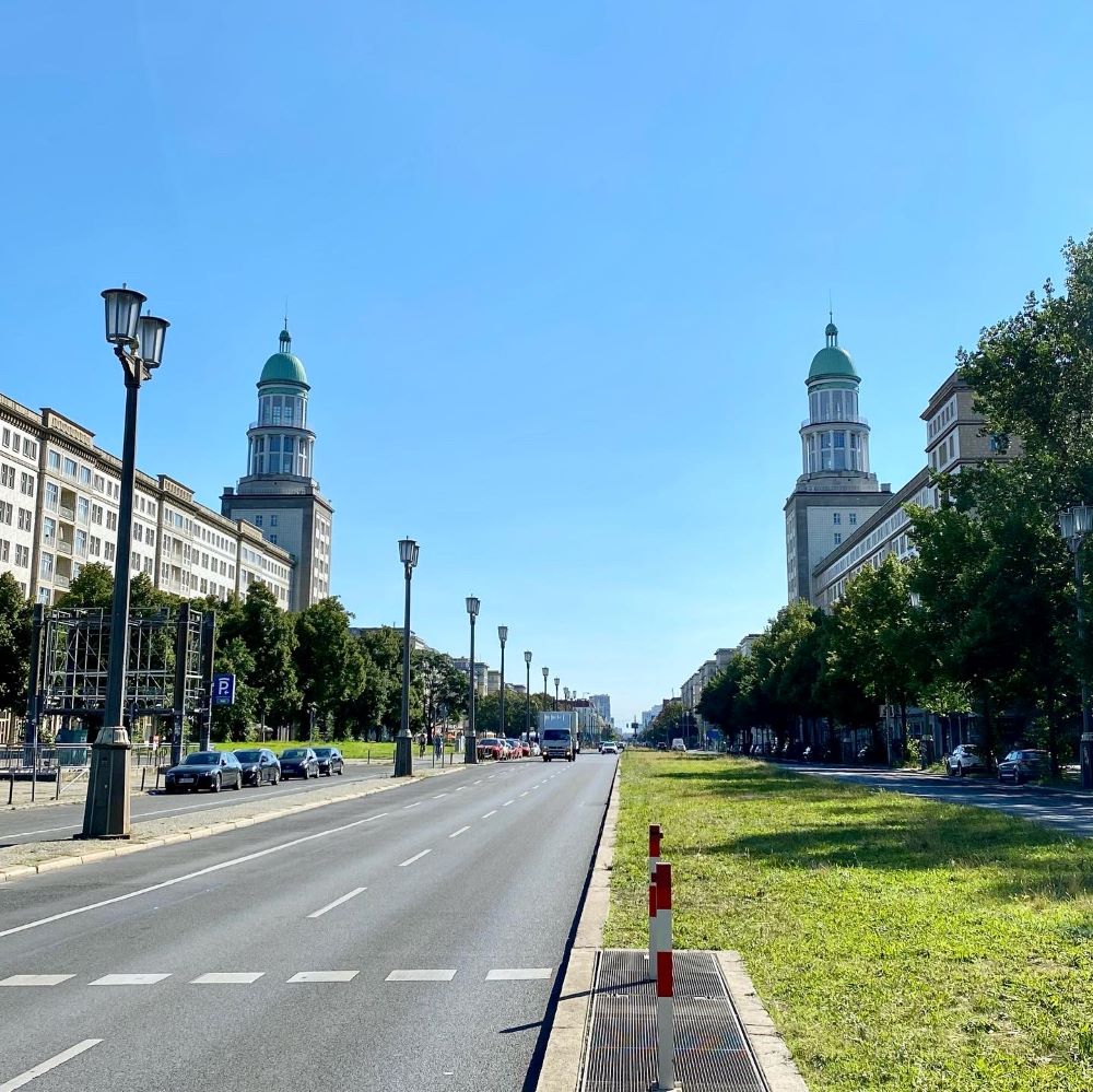 1950 wurden zunächst zwei Laubenganghäuser nach Entwürfen von Hans Scharoun am westlichen Ende der Allee errichtet. Scharoun hatte sich bereits in den 1920er Jahren für die Großsiedlung Siemensstadt in Westberlin verantwortlich gezeigt und wie Bruno Taut (Hufeisensiedlung, siehe Berlin 02/2022) oder Erich Mendelsohn (WOGA-Komplex am Lehniner Platz, siehe Berlin 09/2020) zählte er zu den Vertretern des Neuen Bauens. Nach Kriegsende ernannte ihn die sowjetische Militärverwaltung zum ersten Stadtbaurat von Berlin, doch innerhalb der Nomenklatura der DDR galten ausgerechnet die schlichten und funktionalen Entwürfe des Neuen Bauens fortan als westlich-dekadent. Stattdessen wurde eine Gruppe von Architekten auf Studienreise nach Moskau geschickt. Sie sollten nun den pompösen Stil des Sozialistischer Klassizismus kopieren (den so genannten Zuckerbäckerstil).