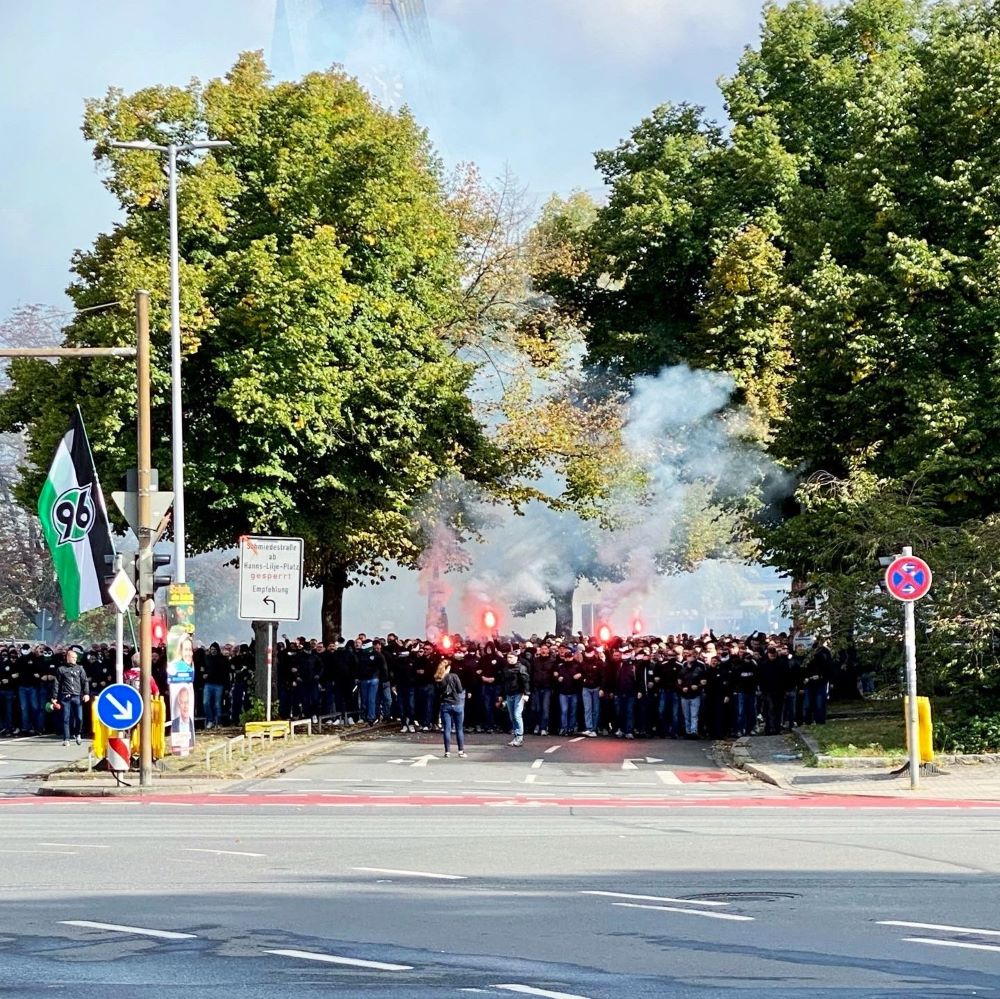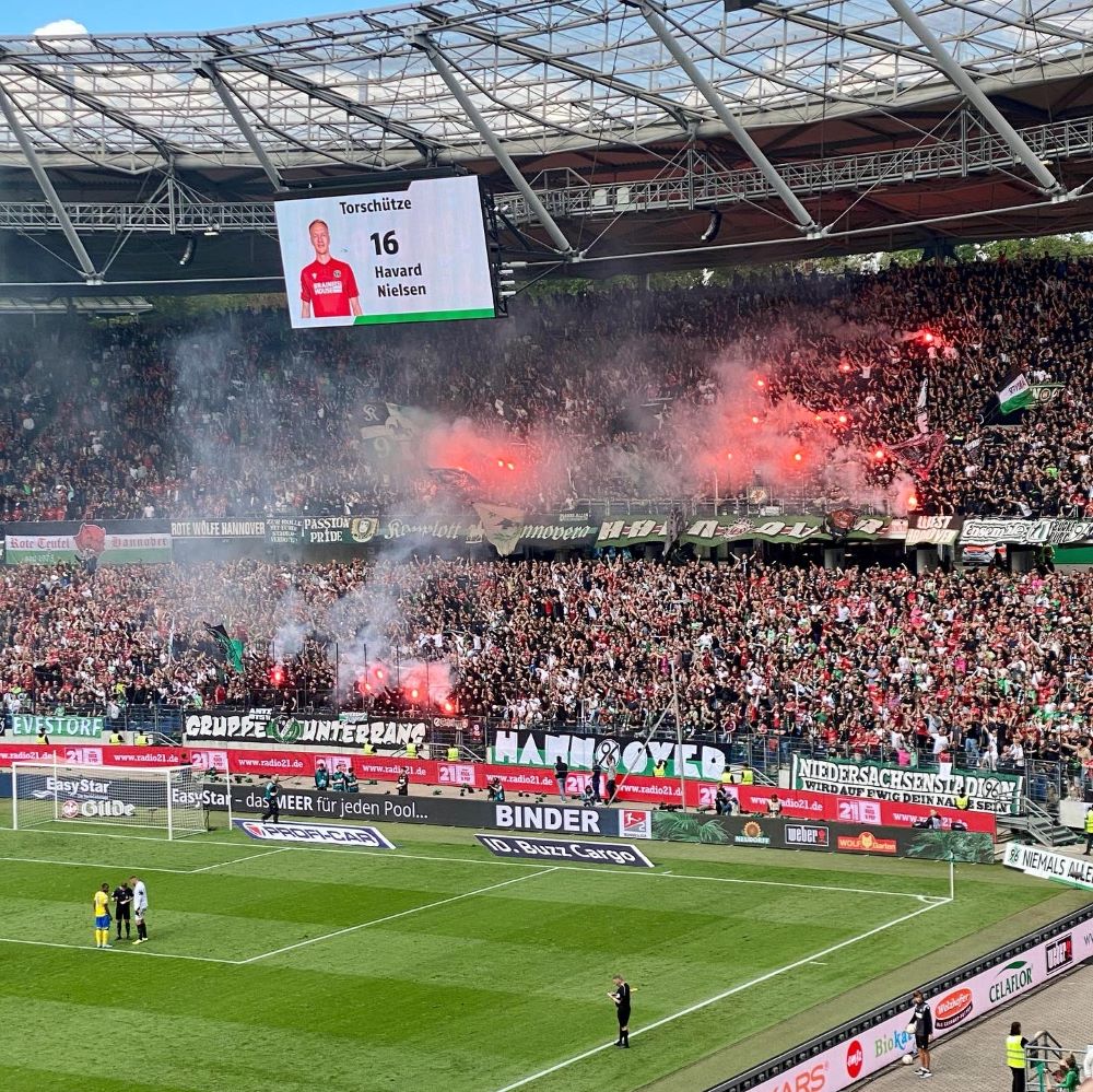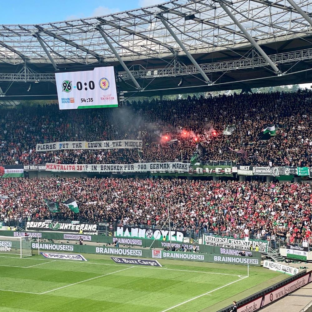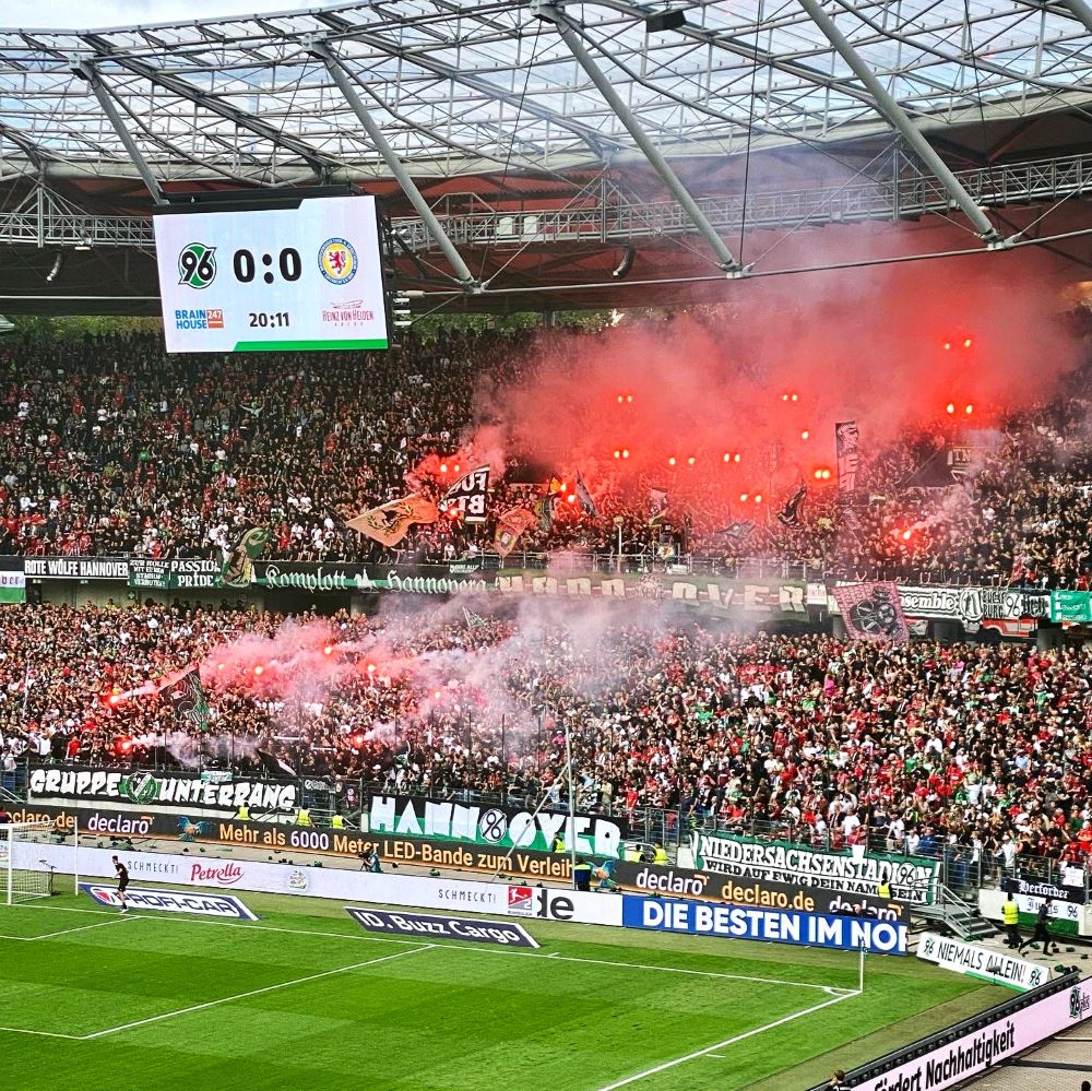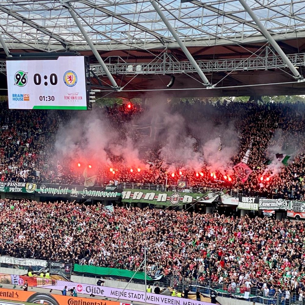 Außer den Choreographien gab es natürlich noch viel Pyrotechnik im Gästesektor und noch viel mehr Pyrotechnik in der Heimkurve. Leider brannte der Rasen nicht so wie die Fanblöcke und trotz der höheren fußballerischen Qualität und durchweg besserer statistischer Kennzahlen, konnte der Favorit in den roten Dressen nicht den ersehnten und eigentlich obligatorischen Heimsieg erringen. Ich hatte das Gefühl die Leitl-Elf wollte auf keinen Fall verlieren, aber auch nicht um jeden Preis gewinnen. Den limitierten Gästen genügte nun der nötige Biss in den Zweikämpfen und eine kurze gute Phase nach Wiederanpfiff, um einen Punkt aus Hannover zu entführen. Endlich mal wieder nicht gegen 96 verloren zu haben zauberte den Mitgereisten eine Freude ins Gesicht, die ihnen in ihrem tristen Alltag meist verwehrt sein dürfte.