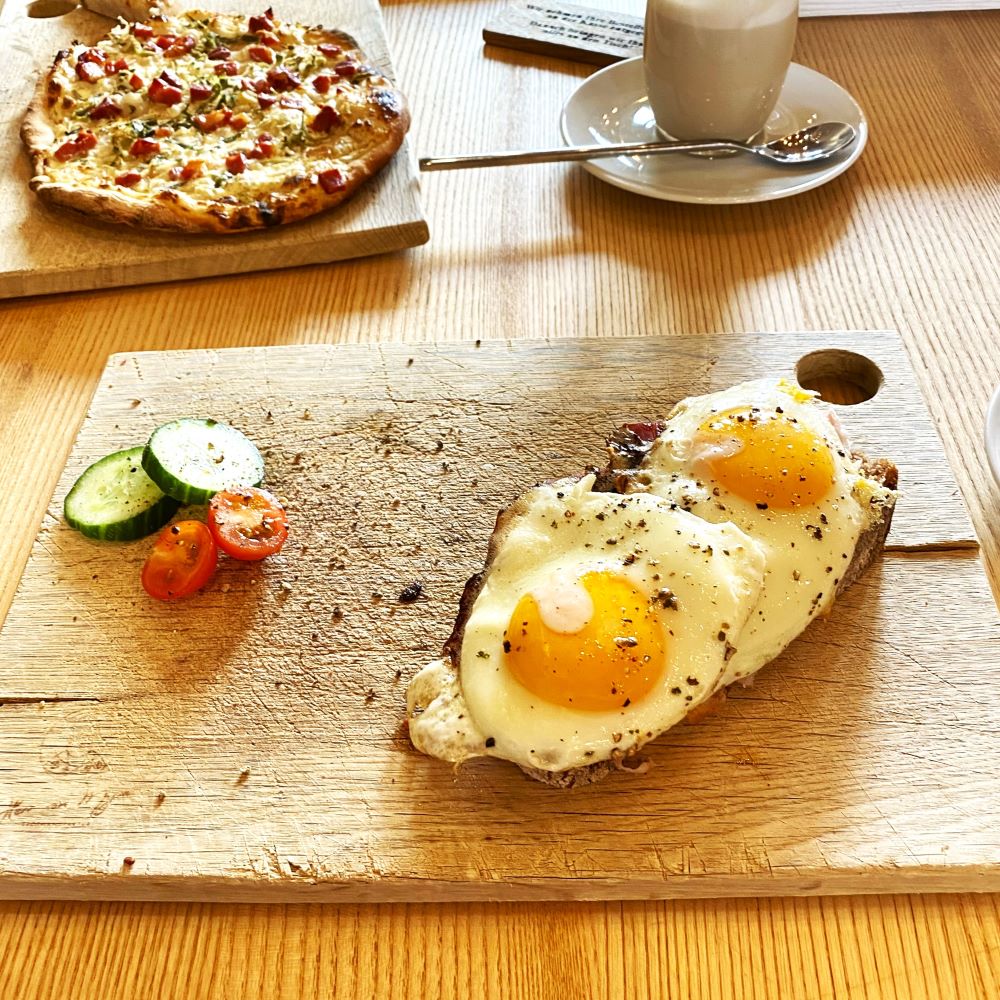 Am nächsten Morgen wollte Glatto natürlich die ganzen Sehenswürdigkeiten der Stadt nochmal bei Tageslicht sehen. Dank der tollen Lage unserer Wohnung war das zumindest in der Altstadt eh zwangsläufig. Ferner wollten wir jedoch auch etwas Streetart am östlichen Ufer der Wisła (Weichsel) im Stadtbezirk Praga begutachten. Das wurde anschließend unsere Vormittagsbeschäftigung, in die wir auch ein Frühstück integrierten. Wir landeten im Caffee & Bistro Galeria Sztuki und damit war uns ein richtiger Glückstreffer gelungen. Glatto hatte vorzügliches Shakshuka und meiner einer ein formidables Omelett mit Pfifferlingen und in Weißwein glasierten Zwiebeln. Auch die gereichten Kaffeespezialitäten genügten höchsten Ansprüchen. Weil nach der Einnahme dieser Mahlzeit die Uhr außerdem schon zur Mittagsstunde geschlagen hatte, ließen wir uns noch ein frischgezaptes Craftbeer servieren.