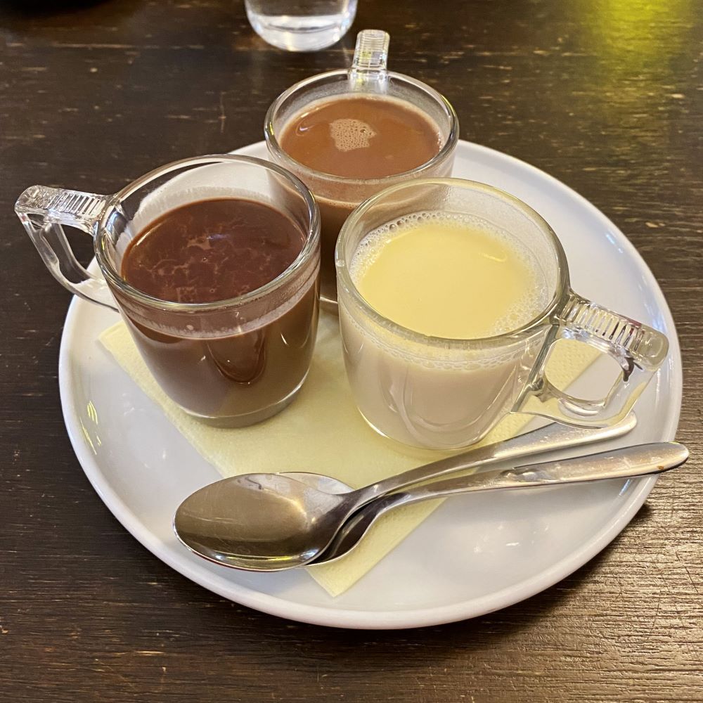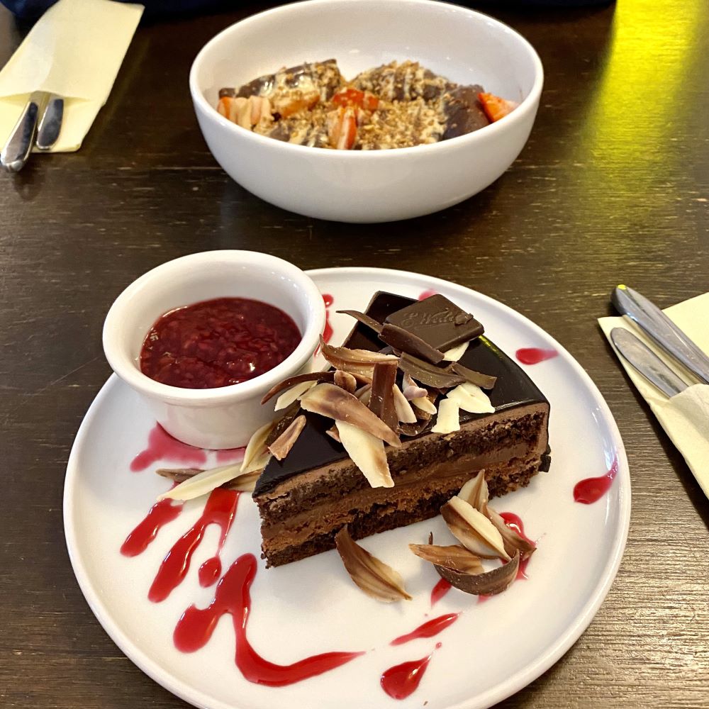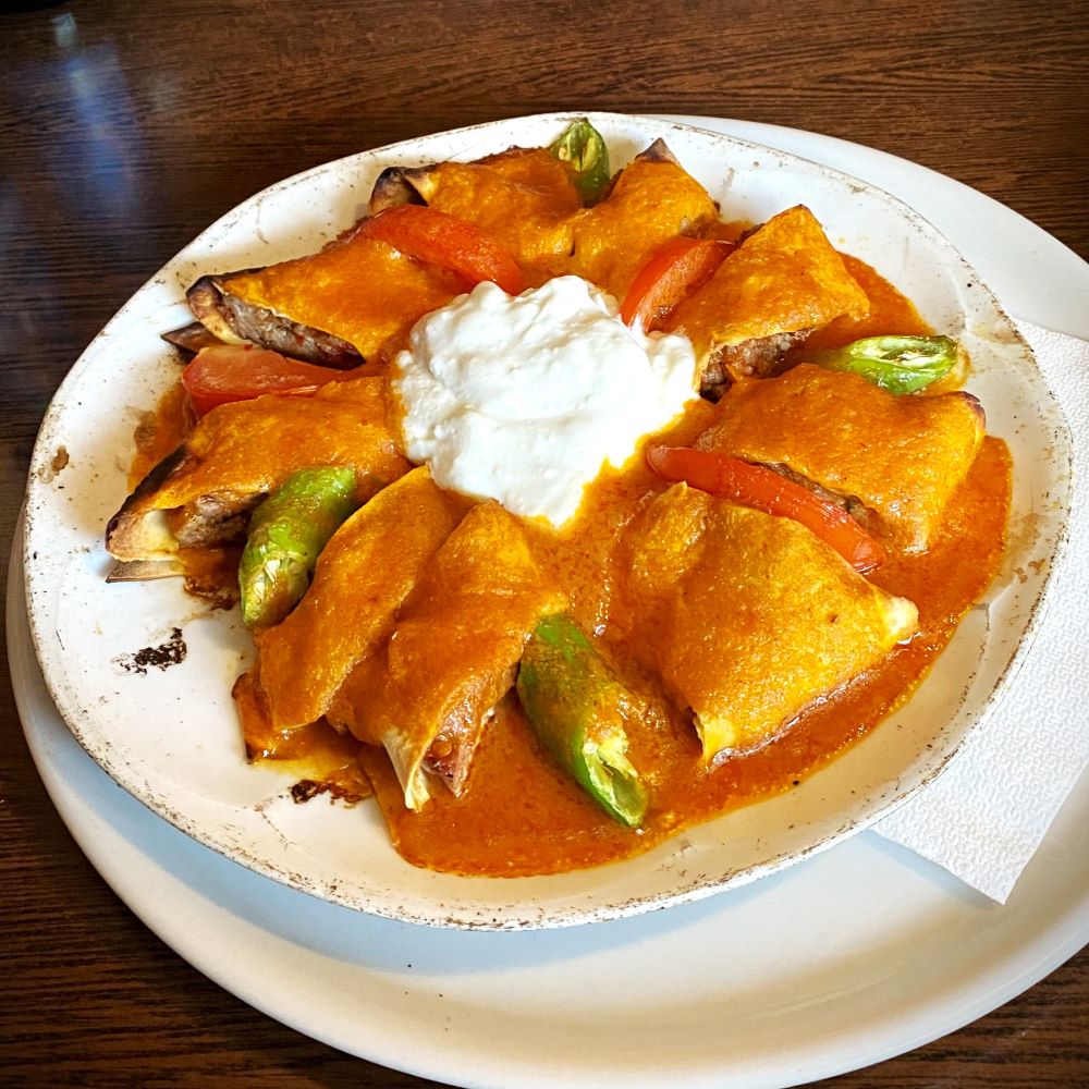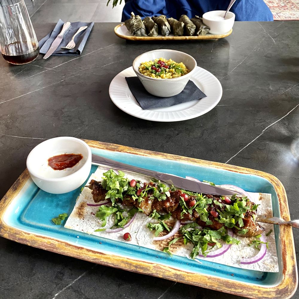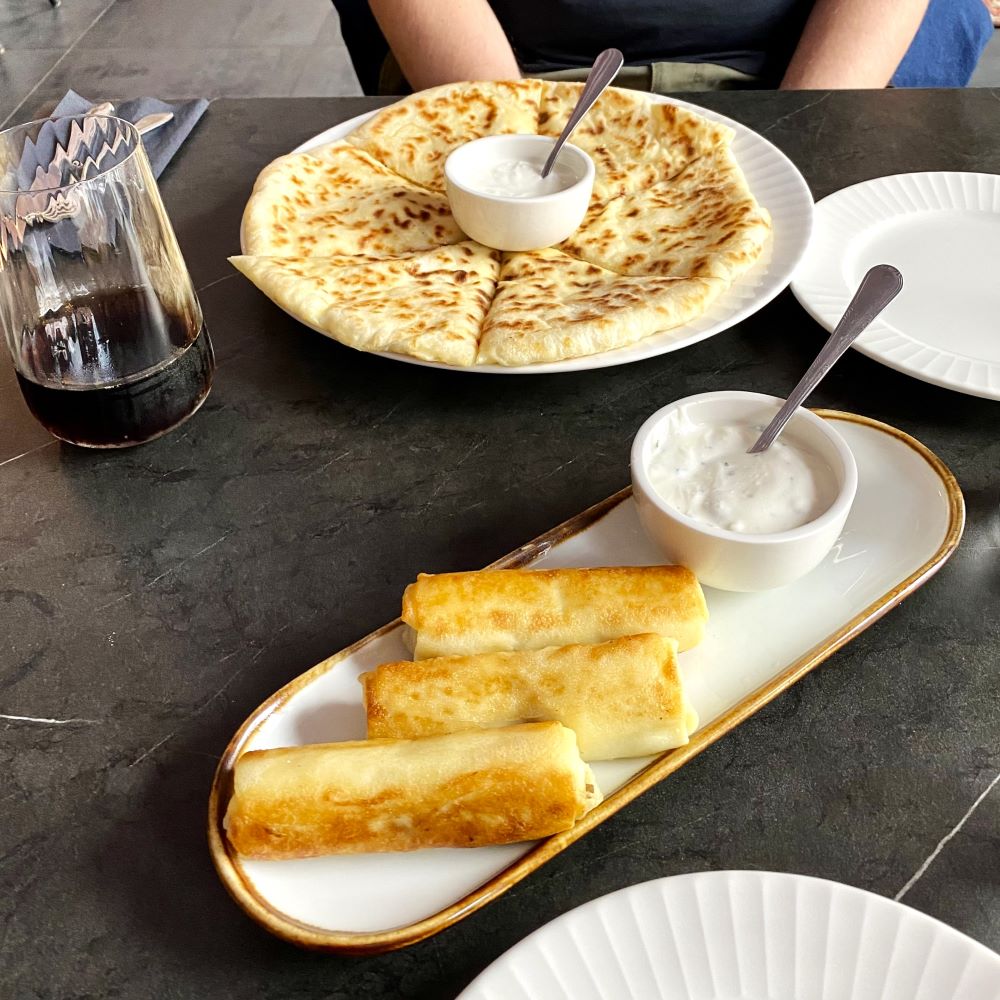 Nachdem wir uns jeder für zwei Gänge entschieden hatten, kam zunächst ein kleiner Gruß aus der Küche. Ein pikantes Möhren-Walnuss-Kompott mit Brotstreifen wurde gereicht. Dann bekam Glatto Chaczapuri (den traditionellen georgischen Käsefladen) und ich Blincziki (Pfannkuchenhackfleischröllchen). Beides von Joghurt-Minz-Sauce begleitet. Mein zweiter Gang war nun Bekeka (Lammschaschlik) mit Bulgur als Beilage, während Glatto Tolma (mit Reis und Hack gefüllte Weinblätter) serviert bekam. Alles außerordentlich delikat und weil das üppige Frühstück erst gute vier Stunden her war, kam uns die eher bescheidene Portionsgröße ausnahmsweise mal entgegen. Andernfalls hätten wir einfach zu einem dritten Gang gegriffen.