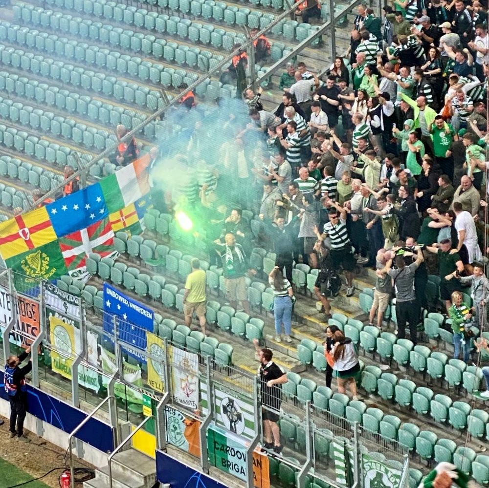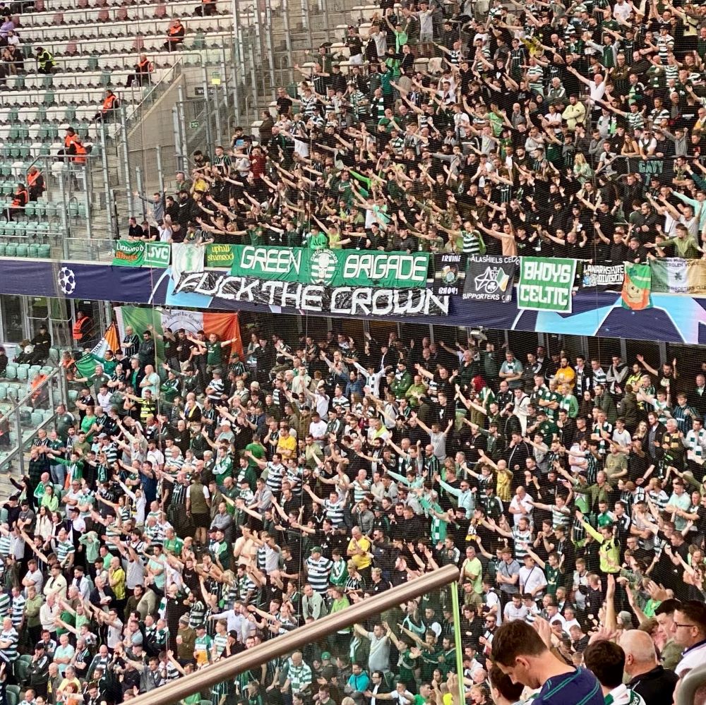 Statt planmäßigen 10 Minuten, dauerte die Fahrt schon über eine halbe Stunde, als wir eine Station vor’m Stadion die Reißleine zogen und die letzten 1.000 Meter zu Fuß zurücklegten. Immerhin in der 6.Spielminute saßen wir auf unseren Plätzen am Rand der Haupttribüne. Verpasst hatten wir außer der Hymne der UEFA Champions League wohl nichts besonderes (deren musikalisches Vorbild Zadok The Priest wird übrigens bei der baldigen Krönungszeremonie von Charles III. erklingen). Lediglich war im Nachgang des Spiels auf Fotos zu sehen, dass die Celtic-Fans zu Spielbeginn per Spruchband an Michael Fagan erinnert hatten (der 1982 ins Schlafzimmer der Queen einsteigen konnte). Eine Banderole mit der Parole “Fuck the Crown” hing unterdessen das ganze Spiel über an der Brüstung des Gästebereichs.