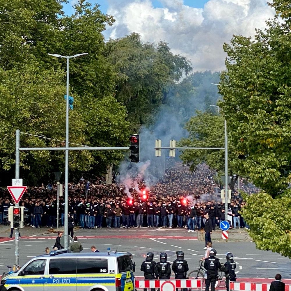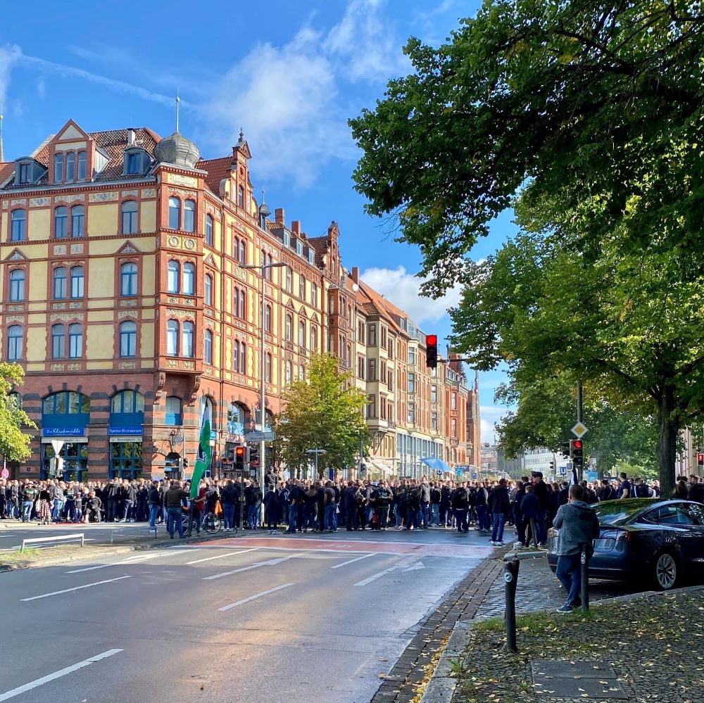 Gegen 10 Uhr formierte sich schließlich ein Aufzug von ungefähr 9.600 Menschen in der Karmarschstraße, der sich um 10:30 Uhr mit viel Getöse in Bewegung setzte. Mit verschiedenen Gesängen, Hüpfeinlagen und immer wieder Fackeln und Raketen zog der Tross zum Nordufer des Maschsees. Dort wurde mir aufgrund meiner exponierten Position am Sprengel-Museum auch erstmals die stolze Gesamtlänge des Aufzuges gewahr (siehe Video). So eine Menschenmasse auf den Straßen einer Hauptstadt wird in nächster Zeit wohl nur beim Begräbnis einer just mit 96 Jahren dahingeschiedenen Monarchin übertroffen.