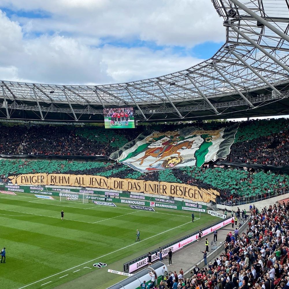Die gute Elizabeth II. war bekanntlich eine direkte Nachfahrin von Georg I., der 1714 als Kurfürst von Hannover in Personalunion auch den Königsthron in London bestieg. An den royalen Glanz der hannoverschen Geschichte erinnerte nun gewissermaßen auch die Choreographie in der Nordkurve. Über schwarze und grüne Papptafeln wurde eine Blockfahne gespannt, die wiederum einen hannoverschen Husaren aus dem frühen 19.Jahrhundert zeigte und dementsprechend optisch an das Reiterstandbild von König Ernst August I. vor dem hannoverschen Hauptbahnhof erinnerte. Dieser Krieger zu Pferde hatte einem Löwen mit seinem Säbel den Kopf abgeschlagen und an der blutigen Waffe baumelte noch ein blau-gelber Fanschal. Schwarz-weiß-grüne Flaggen rechts und links, sowie eine 96 im Siegeskranz und eine Banderole mit der Aufschrift „Königreich Hannover“ rahmten das edle Motiv ein. Dazu prangte unten am Zaun der Leitspruch „Ewiger Ruhm all jenen, die das Untier besiegen“. Respekt, da steckte richtig viel Arbeit drin und mit dem Detailreichtum und der Farbvielfalt war es ein ganz anderes Niveau als in der Kurve gegenüber.
