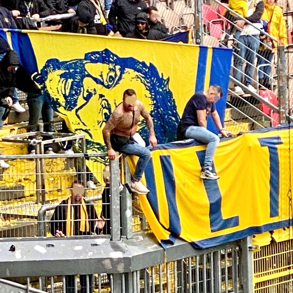 Der Gästeblock füllte sich dagegen erst kurz vor Spielbeginn und optisch wahrnehmbare Unterstützung aus Mannheim schien man nicht im Schlepptau zu haben. Beim Beflaggen war außer blau-gelbes Fahnenmaterial lediglich ein fremder Fetzen aus der Fanszene des FC Basel auszumachen. Da Waldhof bereits am Vortag gespielt hatte, irritierte mich das schon. Aber vielleicht ist die Freundschaft auch etwas eingeschlafen. Also wenn meine Freunde vor meiner Haustür bei meinem Feind antreten und mein Verein nicht parallel spielt, laufe ich da doch eigentlich auf, oder?