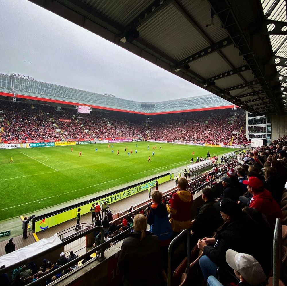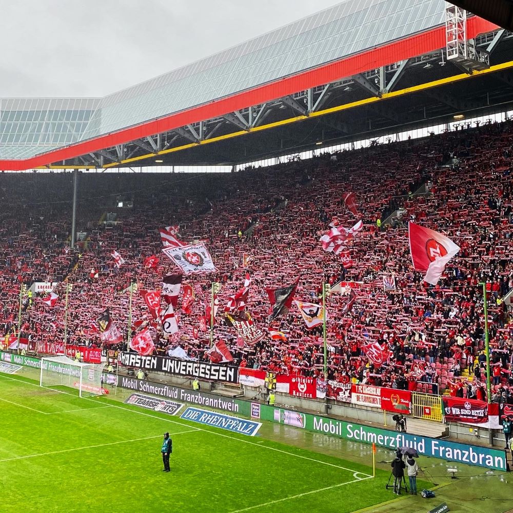 Die S-Bahn, die mich von Eberbach nach Mannheim führen sollte, fuhr passenderweise direkt weiter nach Kaiserslautern und die erstandene Eintrittskarte fungierte zugleich als Fahrschein für die zusätzliche Strecke. Gegen 12:45 Uhr erreichte ich die Stadt am Fuße des Betzenbergs und dementsprechend war es sinnvoll sogleich die Treppen hinauf zum Stadion zu steigen. In der Haupttribüne ging es dann erfreulicherweise per Fahrstuhl in den Oberrang. Bei bester Sicht genoss ich nun wie sich die Westkurve auf das Spiel einstimmte.